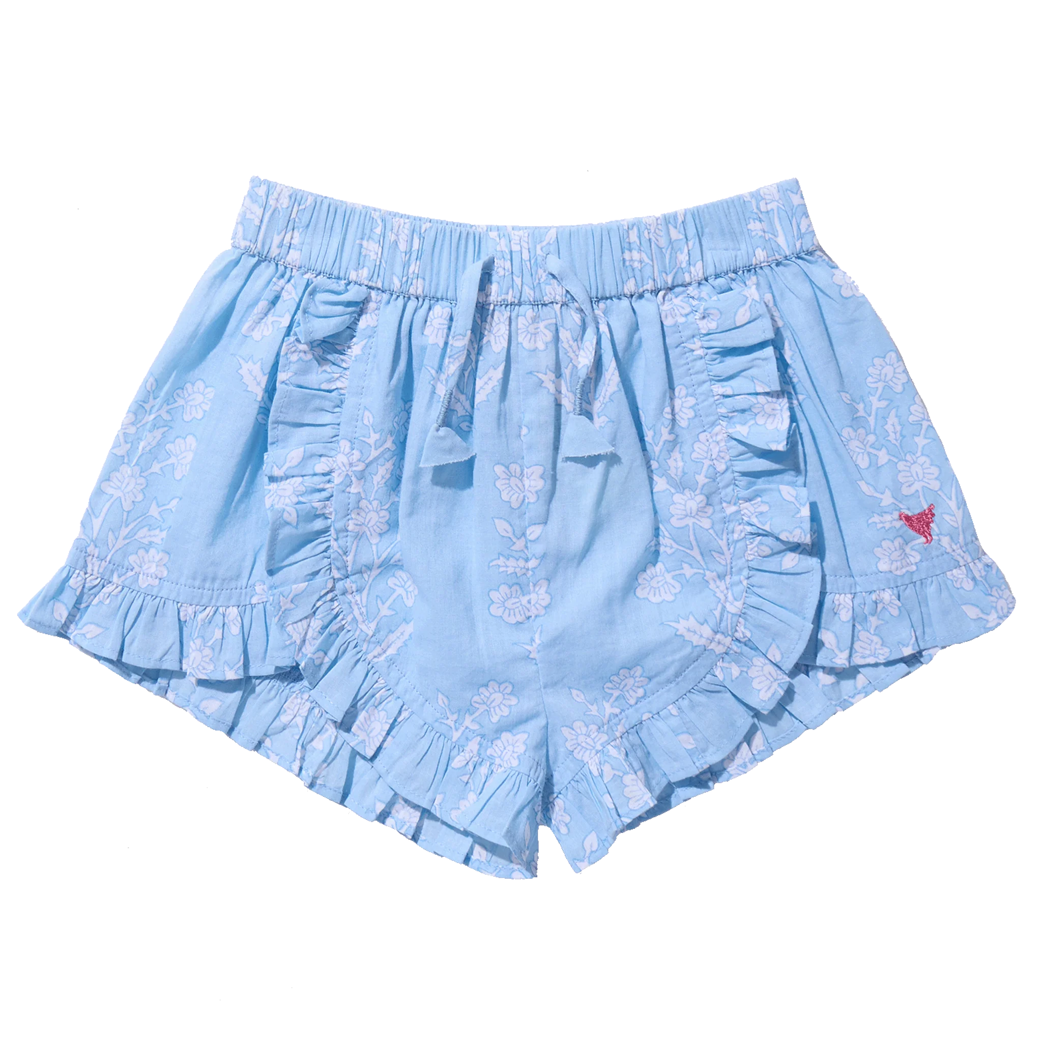 Girls Millie Ruffle Shorts- Blue Dewdrop Block Print