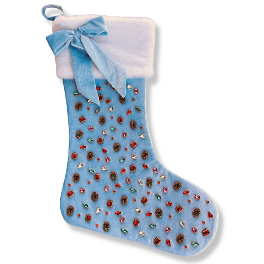 Light Blue Bejeweled Velvet Christmas Stocking with Bow