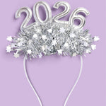 Puffy silver “2026” headband with star tinsel