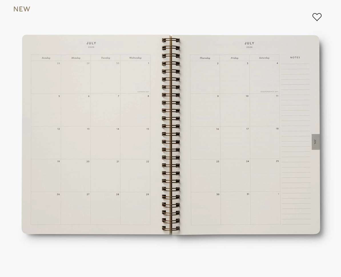 - Monthly and weekly views with space for notes each week and list of celebrations