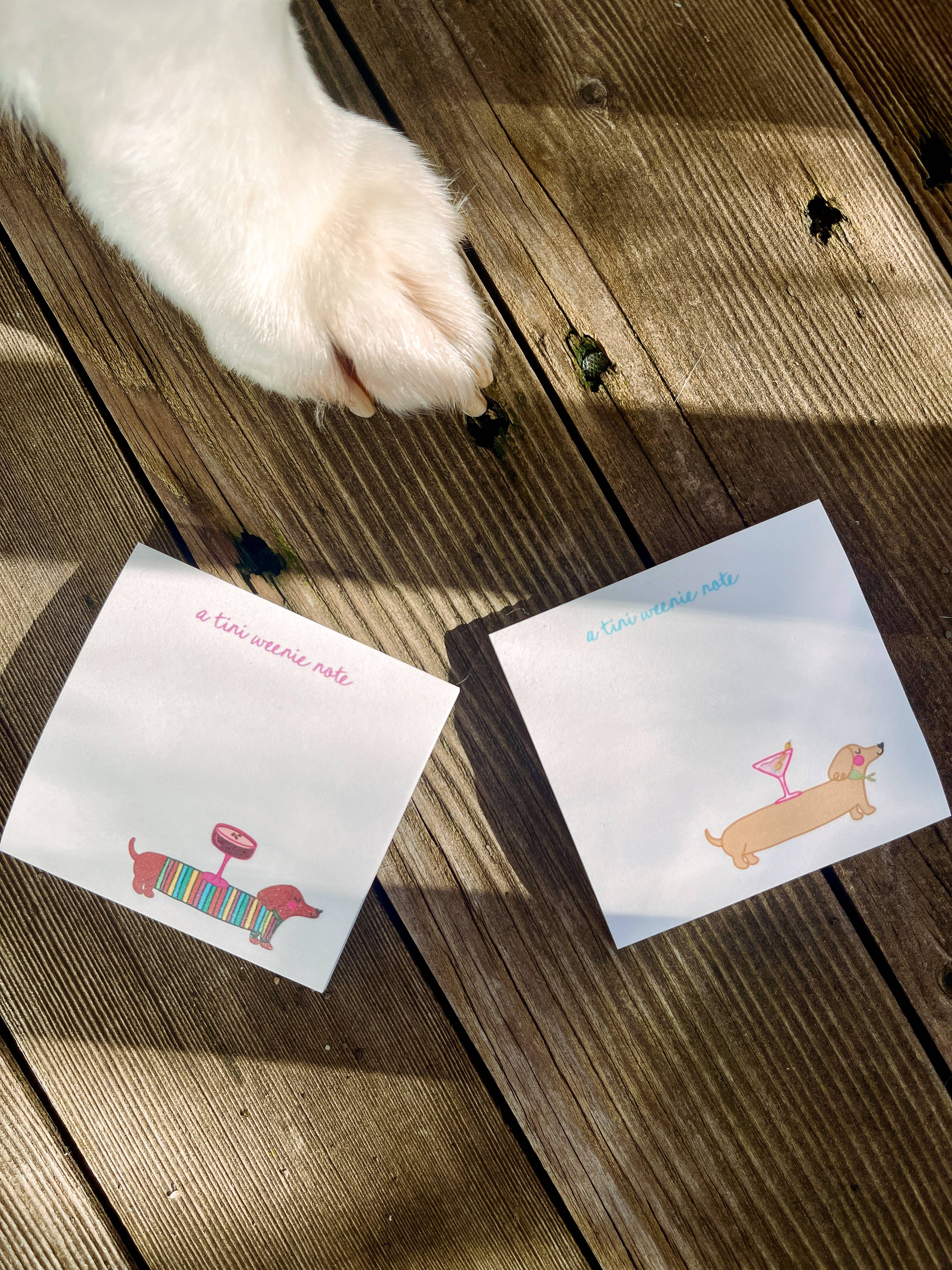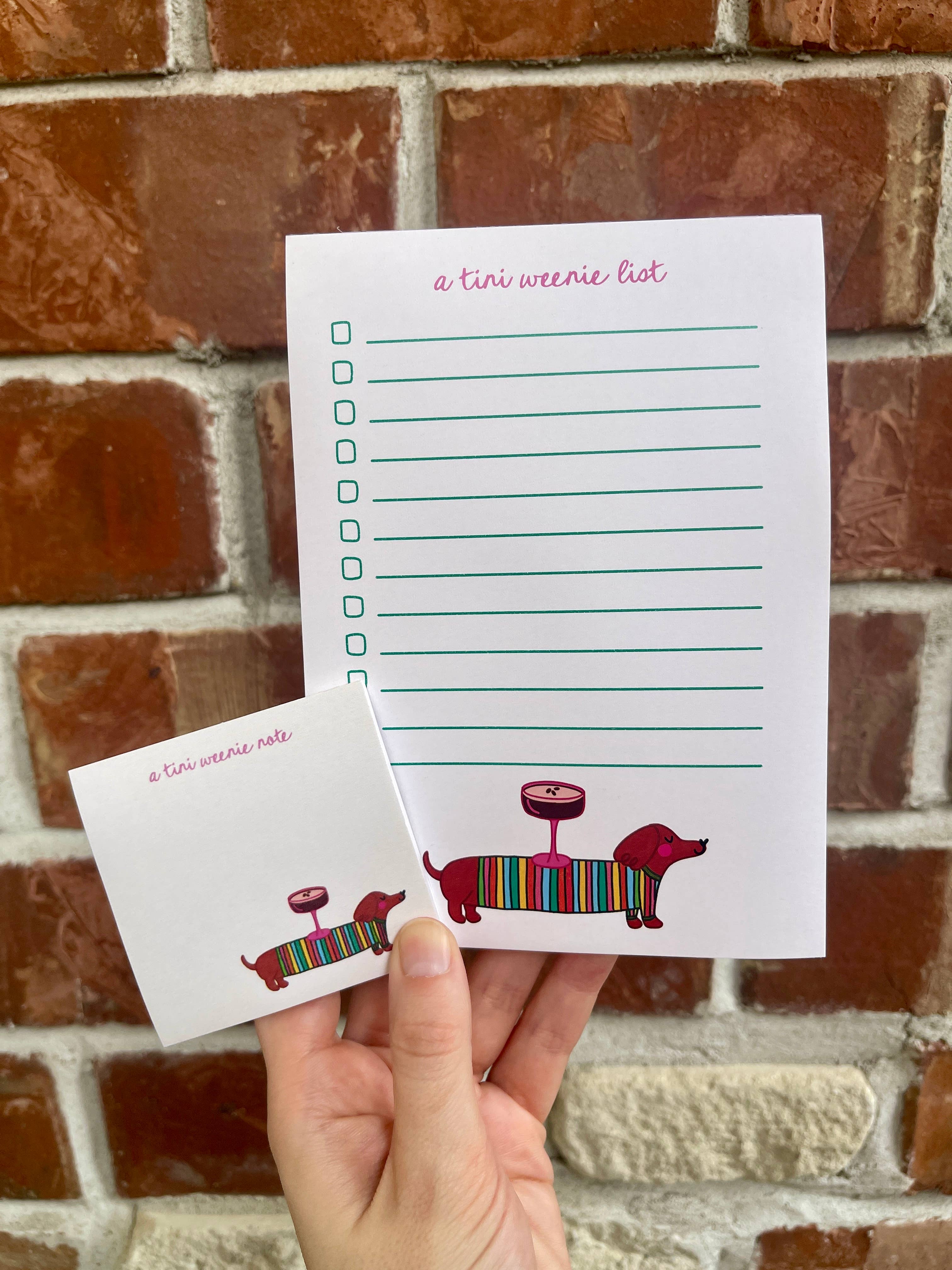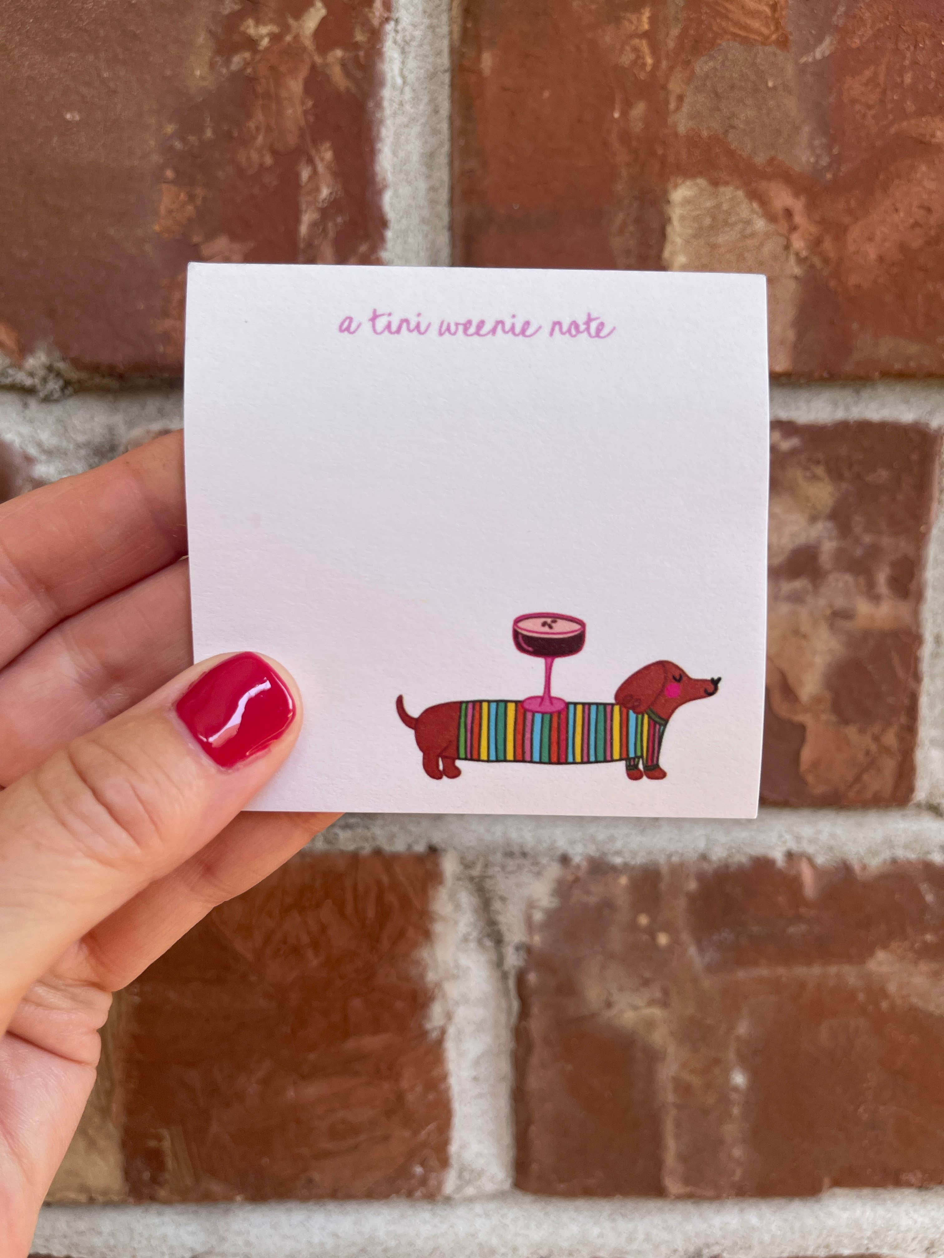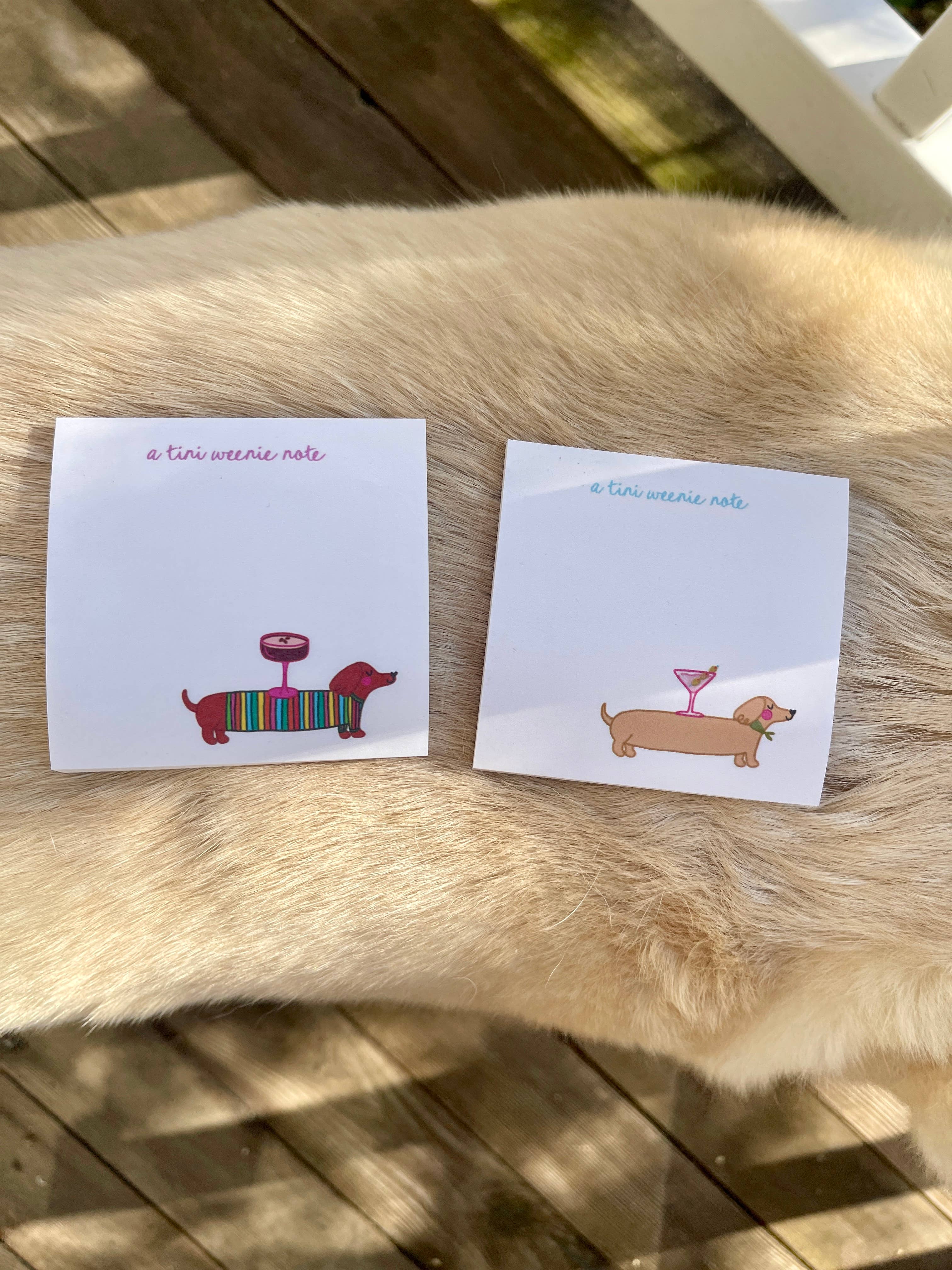 Give yourself a tini weenie round of applause with each note when using this adorable 3x3 sticky note pad (Post It brand), decorated with our best selling "tini weenie" design of a dachshund/weenie dog and an espresso martini along with the phrase "a tini weenie note". Makes a wonderful gift to yourself or someone special to brighten their day. Perfect for dog lovers, just because gifts, cute office stationery, martini lovers, gifts under $15, stocking stuffers, and more! Pair it with our "tini weenie birthday" card to bring it all together!