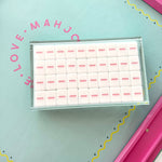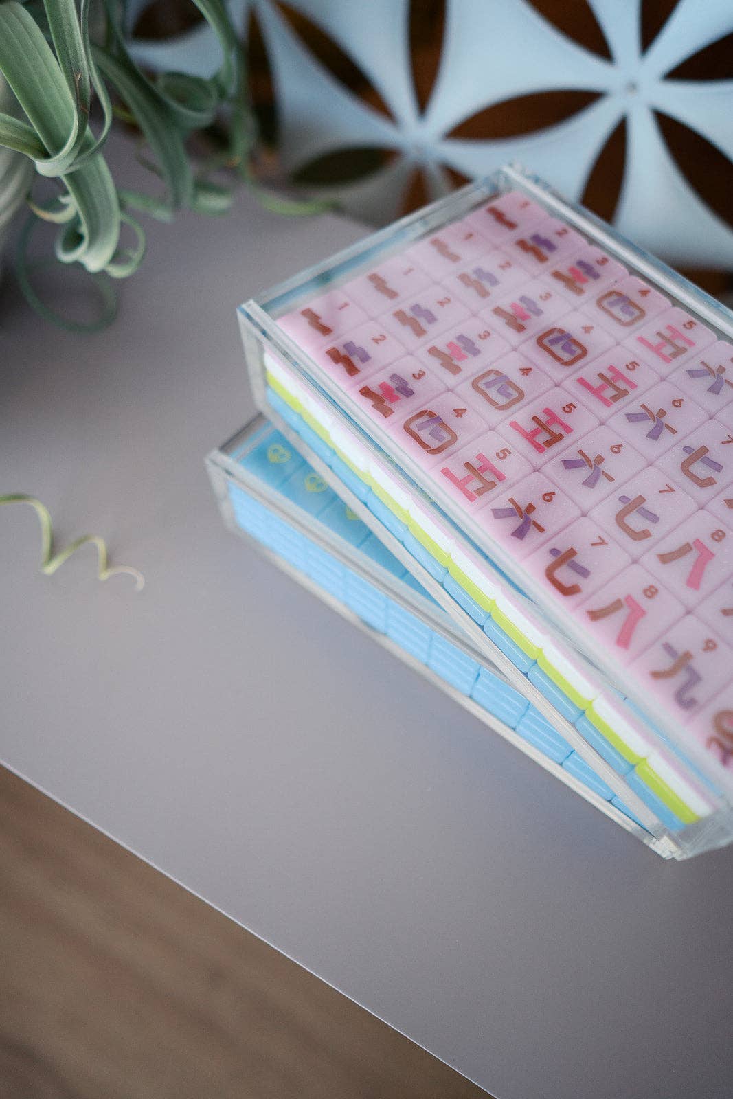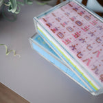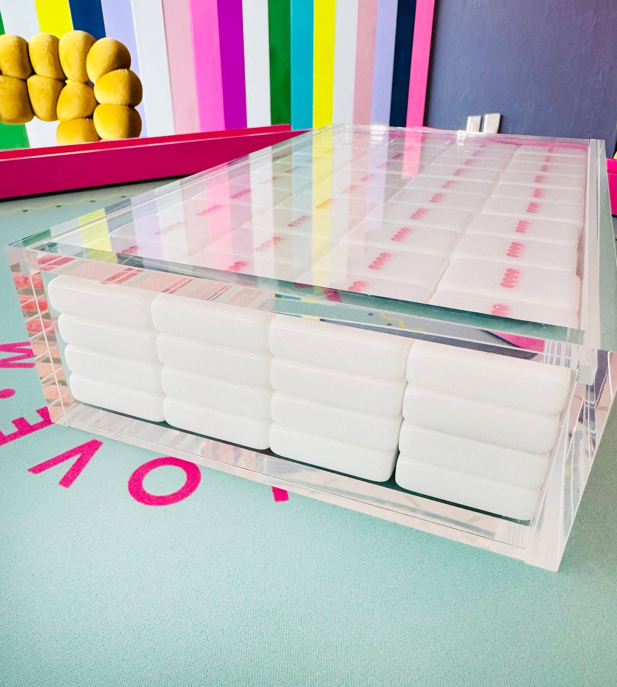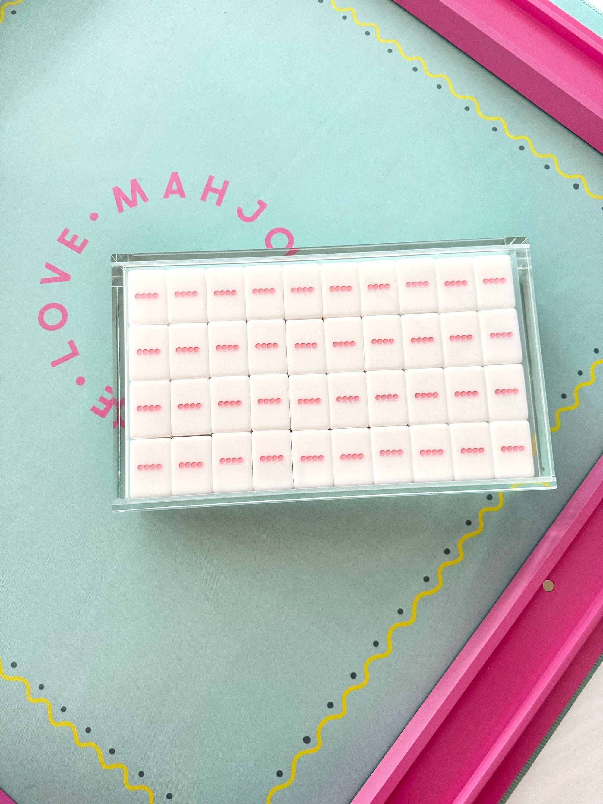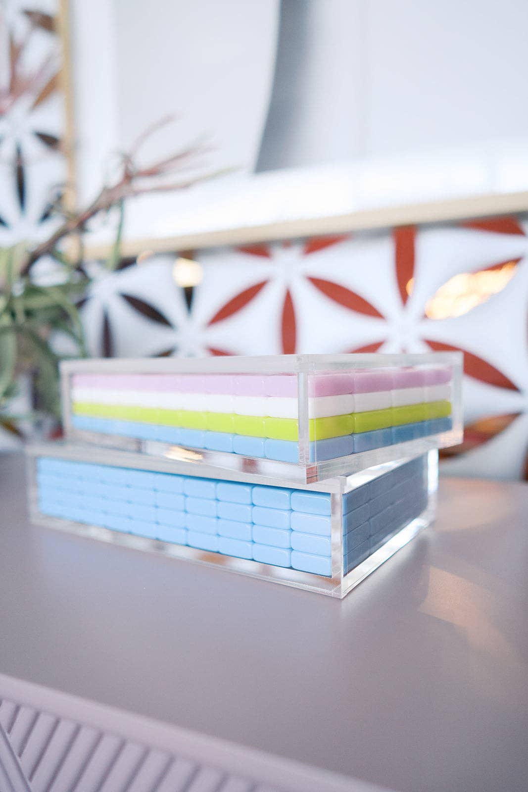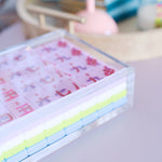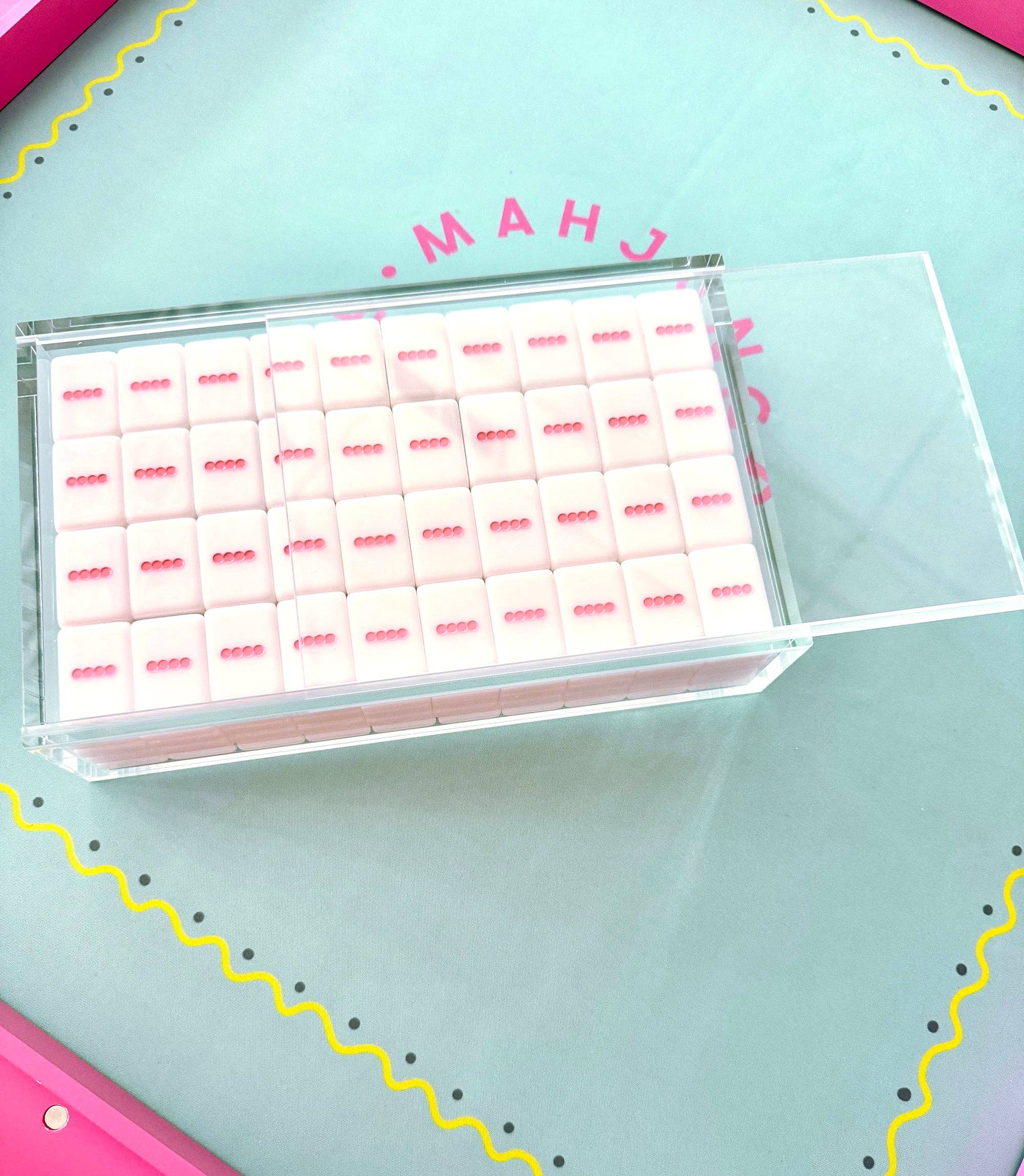 Store and show off your tiles in style! Our brand-new acrylic boxes are made from thick, durable 8mm acrylic and are designed to fit Peace Love Mahjong tiles, TML tiles, and most other similar sized tiles. Each box features a sliding lid that keeps your tiles extra secure—no need to worry about it falling off! Before purchasing, please double-check your tile dimensions against the inside measurements we’ve listed to make sure your set will fit perfectly. Whether you're keeping them safe between games or putting them on display, this box is a chic and practical addition to your Mahjong collection.