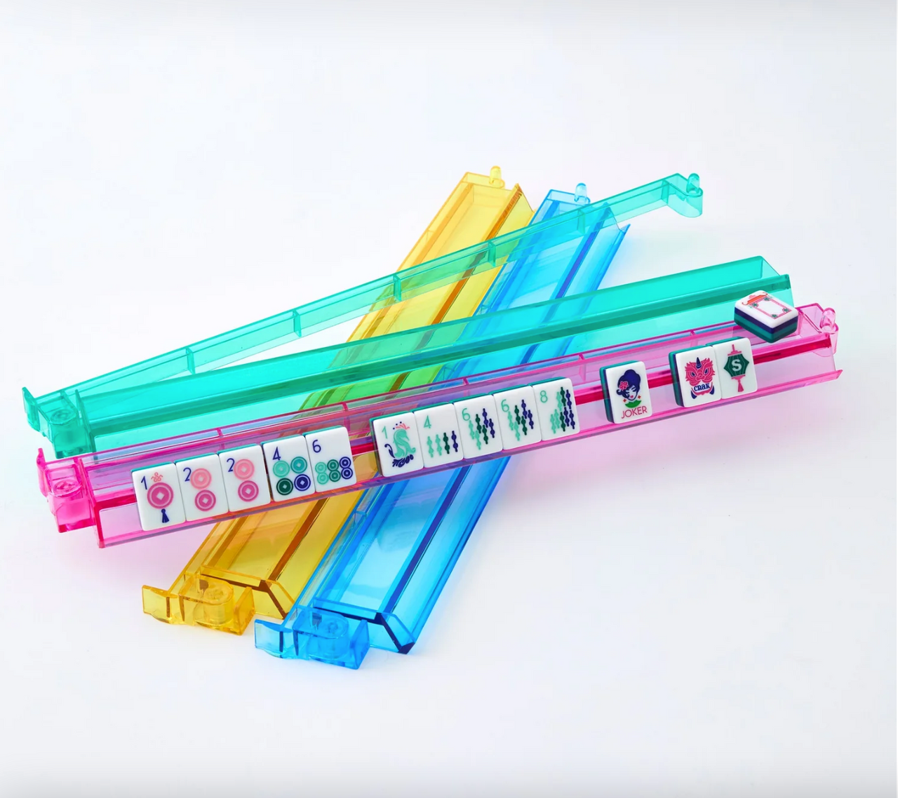 Enhance your game nights with a burst of color and functionality using these multi-color American Mahjong racks and pushers! Engineered for lasting durability and effortless gameplay, these essential accessories elevate both style and performance. Each set includes four acrylic racks with attached pushers in pink, blue, yellow, and green, with a stack length of 18.5 inches. Don't forget to complement your set with our Let's Rack and Roll bag, perfect for storing your racks and pushers in style between games.