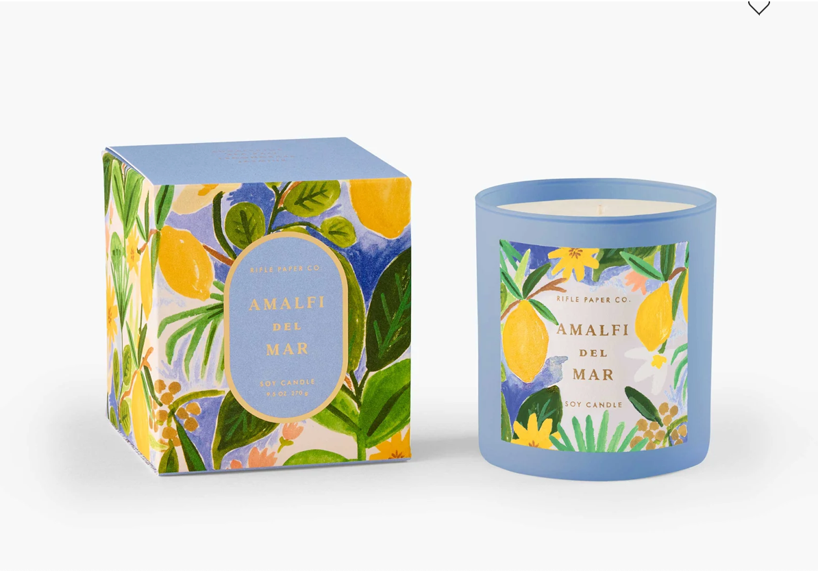 Amalfi del Mar is a blend of lemon, soothing eucalyptus, and the fresh scent of the sea rolling in underneath the cliffside villages along the famous Italian coastline. The 9.5oz soy wax candle comes in a painted glass vessel and is packaged in a decorative gift box with gold foil accents.