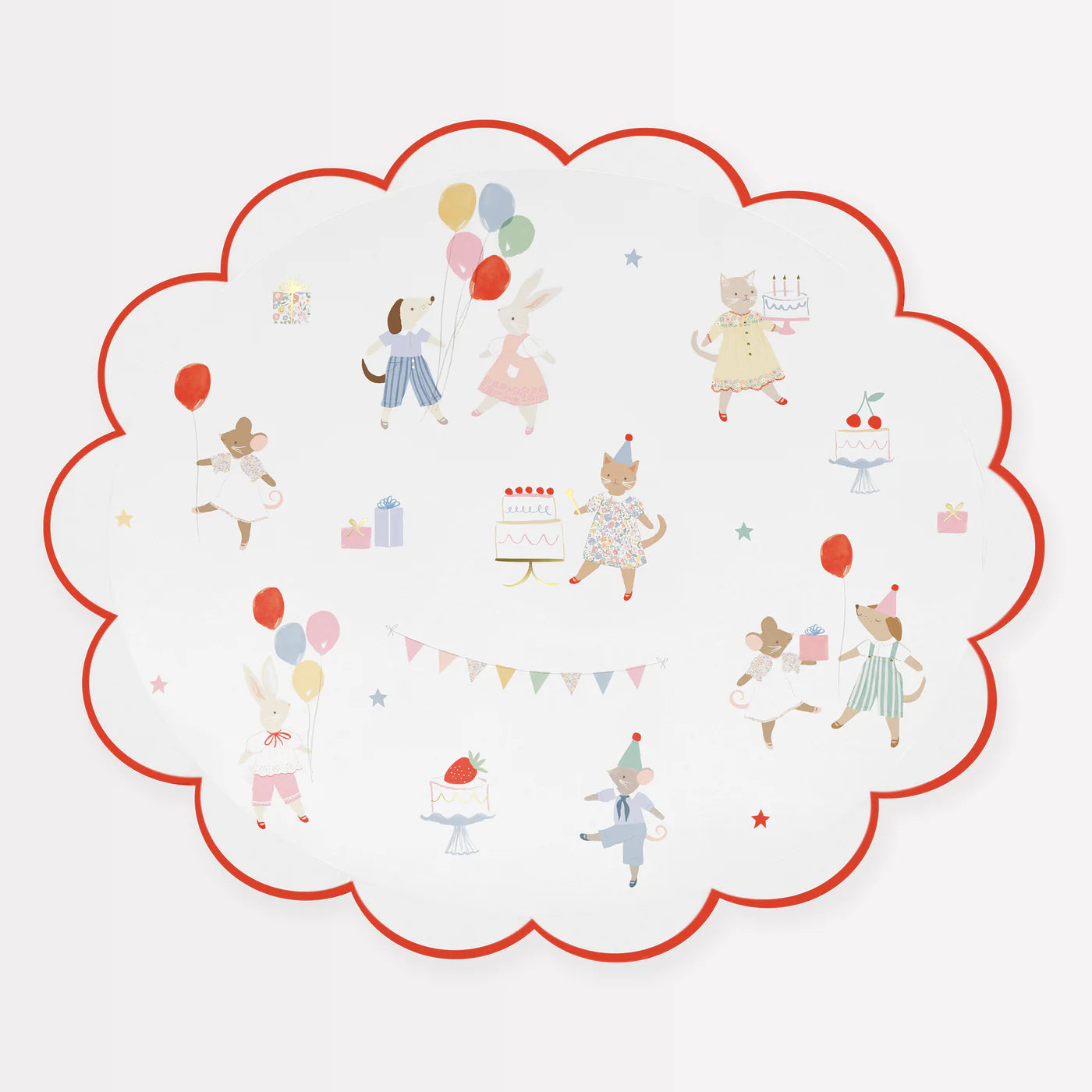 Adorable animal alert! These large paper plates are perfect for early years and first birthdays. Inspired by vintage fashion illustrations and color palettes, with pops of shiny gold foil and a bright red border to keep the look current. This stylish scalloped design is ideal for table layering and to give a decorative touch