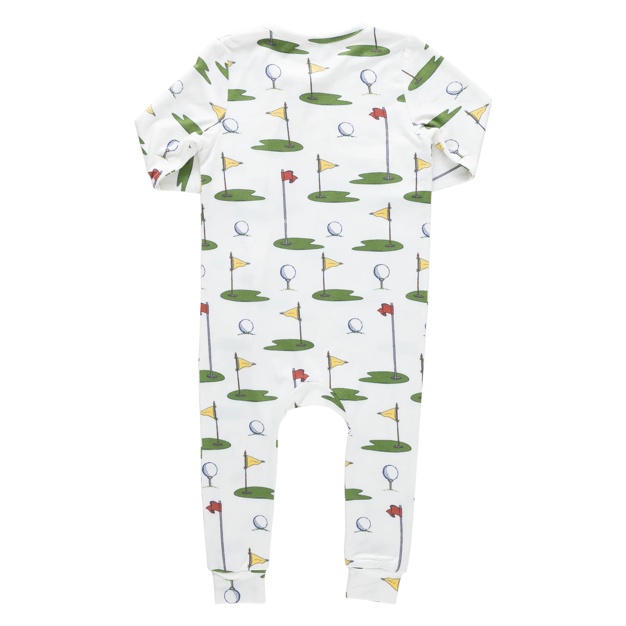 Tee time, but make it cozy! Our super soft Baby Bamboo Romper brings playful charm to everyday snuggles with our whimsical Cream Golf Tournament print. Designed with parents in mind, sizes 0/3m and 3/6m feature fold-over hand and foot cuffs for extra comfort, while a two-way zipper with a protective cover makes diaper changes quick and easy. Crafted from ultra-soft bamboo fabric with a smooth, silk-like feel, this breathable romper helps keep littles cool in warmer weather and comfy year-round.