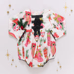 Happy Holly-days! Freshly clipped sprigs of holly tied to vintage ornaments and bells bring christmas cheer to our party-ready Baby Girls Hermione Bubble. This sweet one-piece is adorned with sophisticated black grosgrain ribbon bow accents at the chest, black pearl stitch ruffled trim at the gathered cuff and has an invisible zipper closure at the back. Ring snaps at the legs allow for easy diapering. Twin with Big Sis in our Girls Hermione Dress