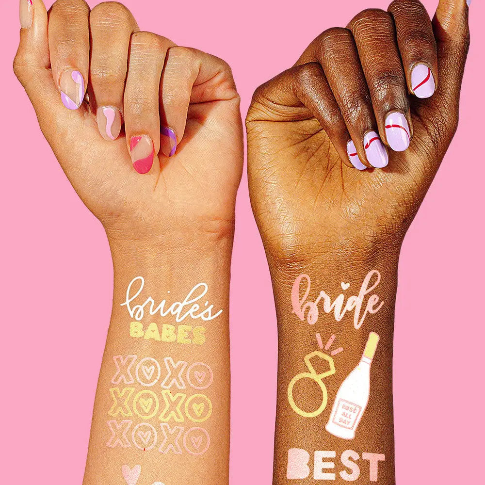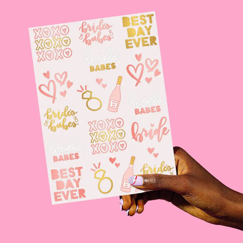 For all the babes and their bride to be. || Picture this, you’re getting ready to throw the most badass bach party for your girl… What’s missing? These temp tats, duh! This pack has 34 metallic styled tats for every one of the babes. Quantity: 34 temporary tattoos Measurements: 8.25” x 6” sheet Vibrant color w/ rose gold + gold metallic foil