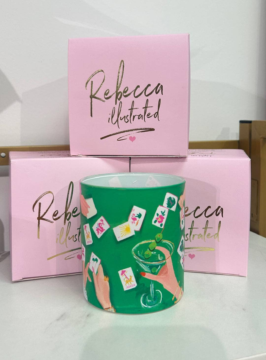 Bring warmth, personality, and playful sophistication to your space with this Rebecca Illustrated Candle, featuring original hand-painted artwork inspired by mahjong nights, cocktails, and stylish entertaining. Wrapped in a vibrant green illustrated vessel showcasing mahjong tiles and a martini in hand, this candle is designed to be both a statement decor piece and a cozy everyday essential. Beautiful on coffee tables, bar carts, or bedside styling, it makes a perfect hostess gift, celebration present, or treat for yourself. Packaged in signature Rebecca Illustrated pink boxes, this candle is as gift-ready as it is eye-catching.