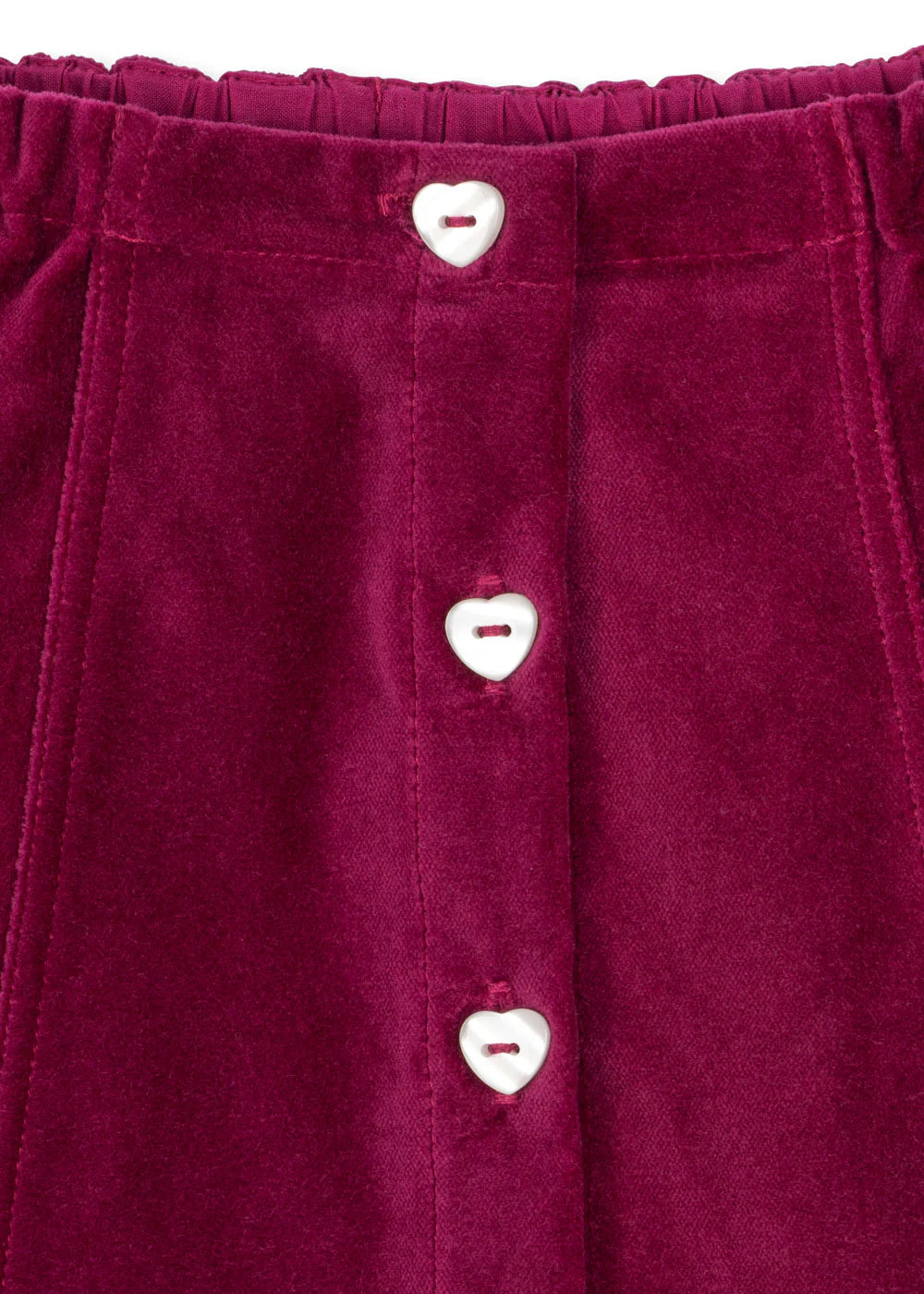 Soft skirt in a heavy velvet fabric that adds a sharp silhouette. Designed with heart shaped front buttons and decorative scallop edges.