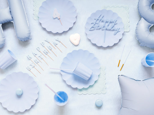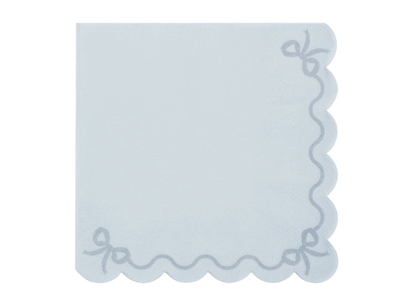 Paper napkins in misty blue color finished with a ruffle. The napkins have a ribbon with a bow print. Dimensions when unfolded: approx. 33 x 33 cm, dimensions when folded: approx. 16.5 x 16.5 cm.