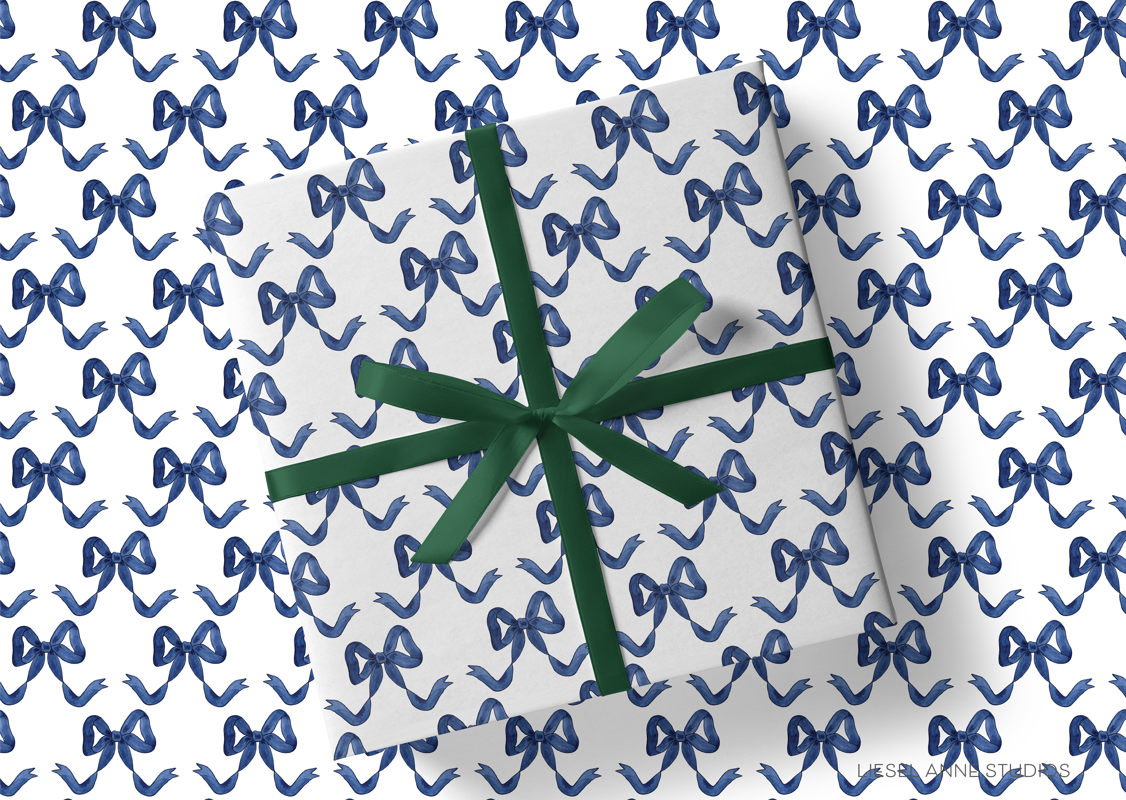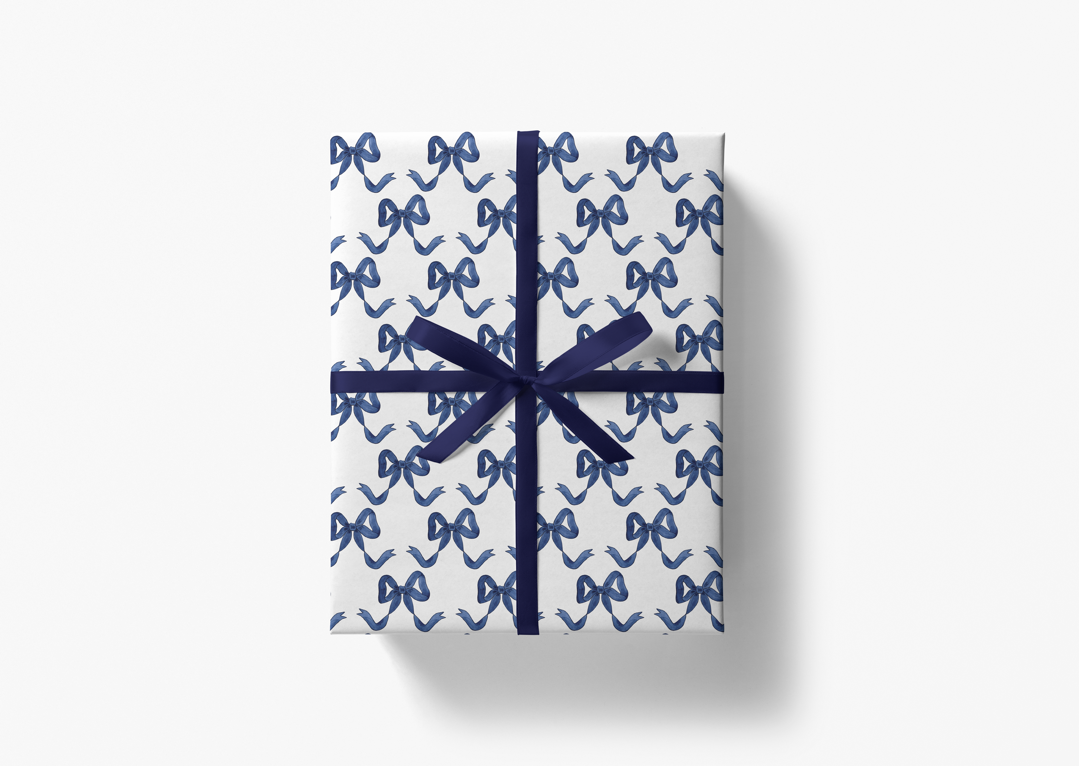 • 3 Individual Wrapping Paper Sheets Rolled In a Cello Sleeve with a Sticker • Each Sheet Measures 20" x 29" • Printed on strong paper with a beautiful matte finish • Painted, designed, printed and packaged in the USA • Hand packaged with care Blue and Whtie Bow Gift Wrap