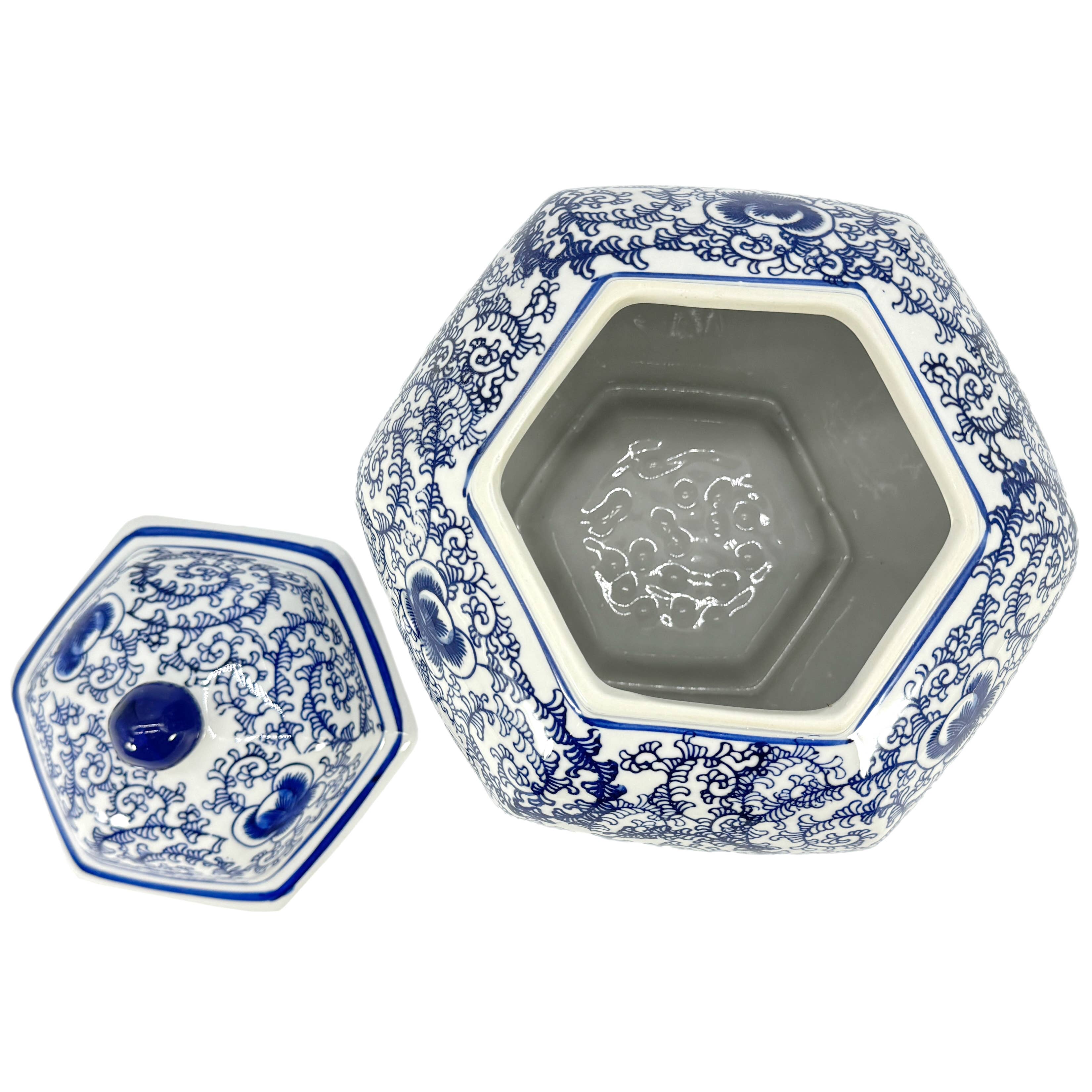 This beautiful blue & white ceramic porcelain style piece is just what you're missing from your home d̩eor. This blue and white piece features an elegant hand-painted design with a glossy finish perfect for your classic, coastal, coastal grandma, style and vibe. Using the Monochromatic blue and white trailing branches and sprigs, this jar will bring in the Asian and Chinese style into your home.
