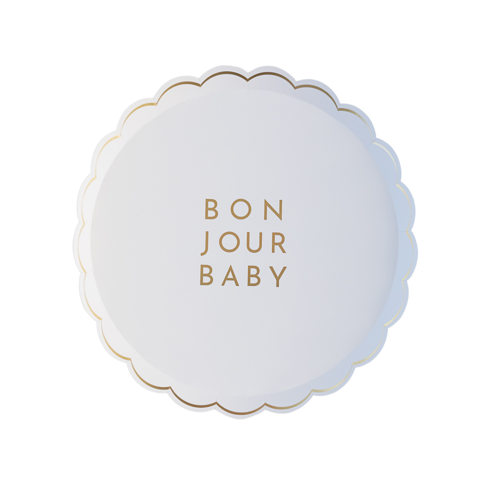 Our Bonjour Baby Blanc White Small Plates are the ideal complement to your baby shower table. Featuring elegant gold foil lettering, these stylish, French-inspired plates bring a refined touch to any baby shower celebration. Welcome, little one!