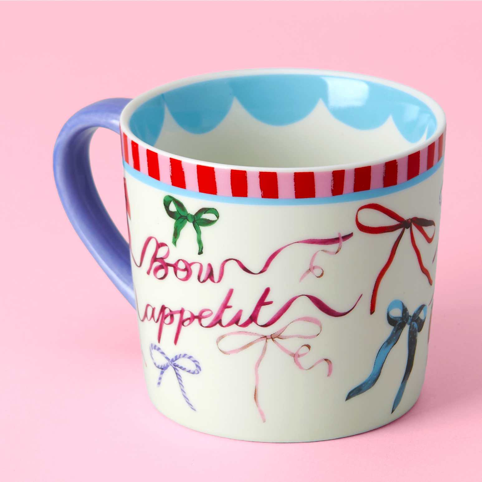 Brighten up your morning routine with our illustrated bow mug! The contrasting pink and red stripes, blue scalloped detail on the inside, and lilac handle add a colourful touch to your favoUrite hot beverage. Finished off with the 'Bow appetit' message. Perfect for adding a little joy to your day.