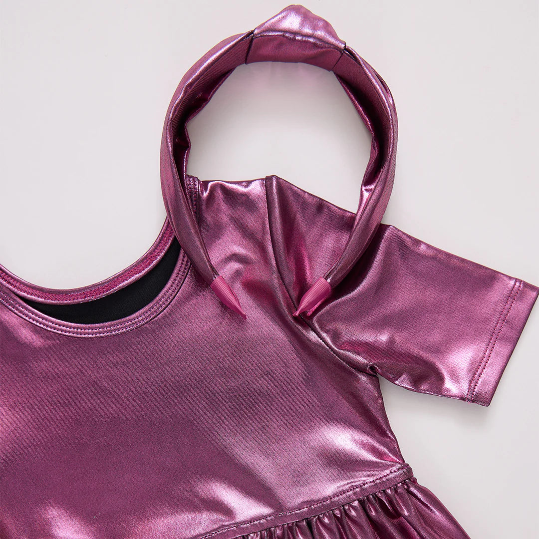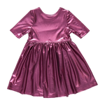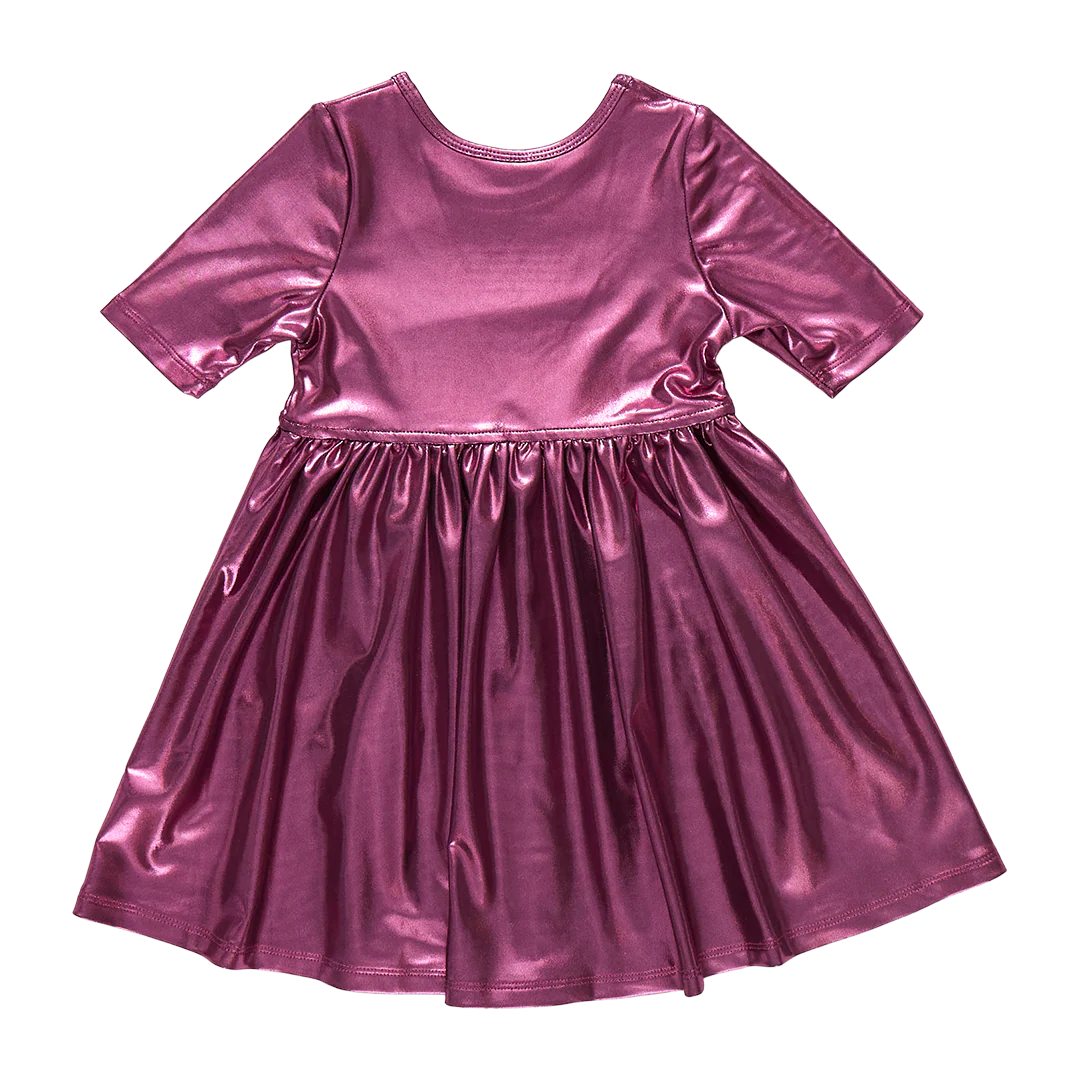 Daily Dazzle! A flock favorite silhouette, our crewneck Girls Lamé Steph Dress takes a star turn in our perfectly pink lamé. This Pink Chicken classic is loved for its roomy fully gathered skirt, puff sleeve and scooped neck.