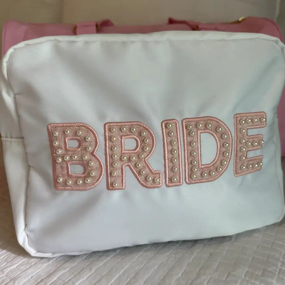 For all my bridessssss! White nylon with pink pearl BRIDE! Perfect bridal shower / day- of gift! Patches sewn on! Interior zipper pocket + 3 pockets Dimensions:27.5*12.5*20.5cm