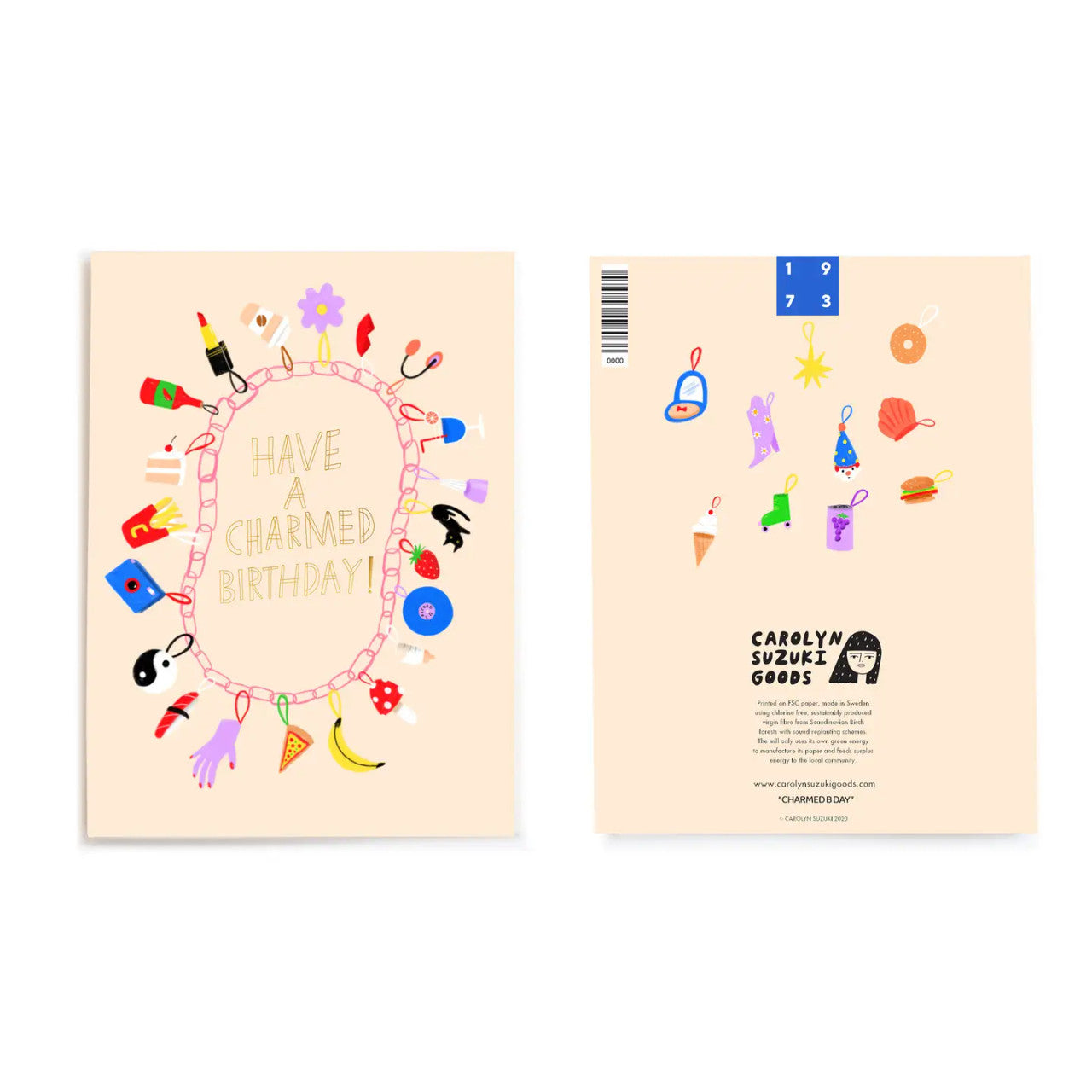 Birthday Card with Gold Foil Embellishment, A2 Size - 4.25 x 5.5 inches. Comes with a coordinated envelope and is packaged in a clear sleeve. Blank inside. Lovingly designed by Carolyn Suzuki in Los Angeles, California. Printed on FSC certified paper in the United Kingdom.