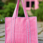 Add a pop of playful charm to your everyday routine with our Pink Checkered Tote Bag! Featuring a classic gingham-inspired checkered pattern in vibrant shades of pink and white, this spacious and lightweight tote is perfect for everything from errands and work to weekend adventures. Designed with durable handles and a roomy interior, it’s both functional and fun. Whether you're heading to the market, beach, or just out and about, this pink tote bag is your go-to for style and convenience.