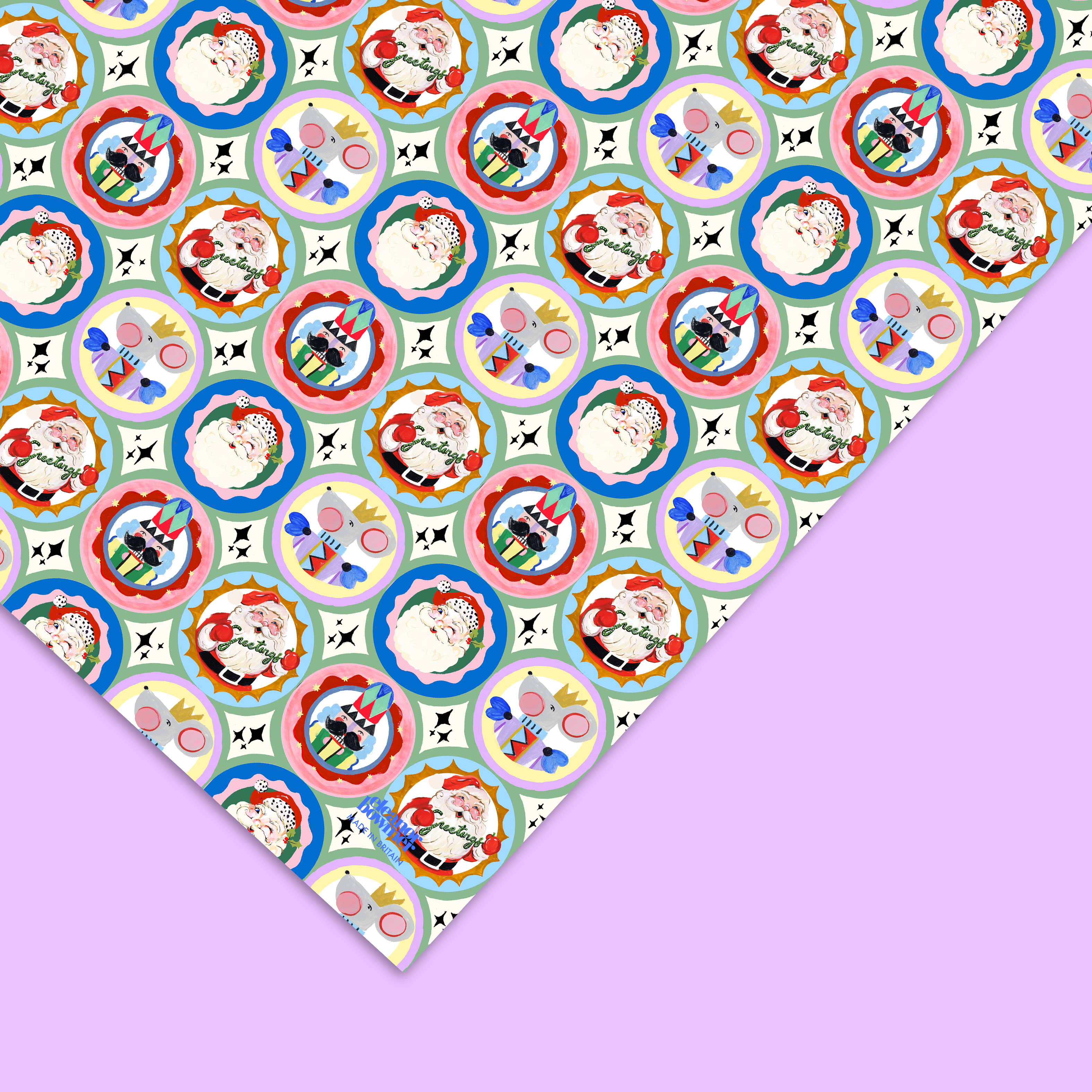 This festive wrapping paper is perfect for both kids and adults. Featuring hand-painted designs of a cheery Santa, nutcracker, and festive mice, this cute Christmas gift wrap will add a touch of holiday cheer to any present. Spread the joy with this charming gift wrap.
