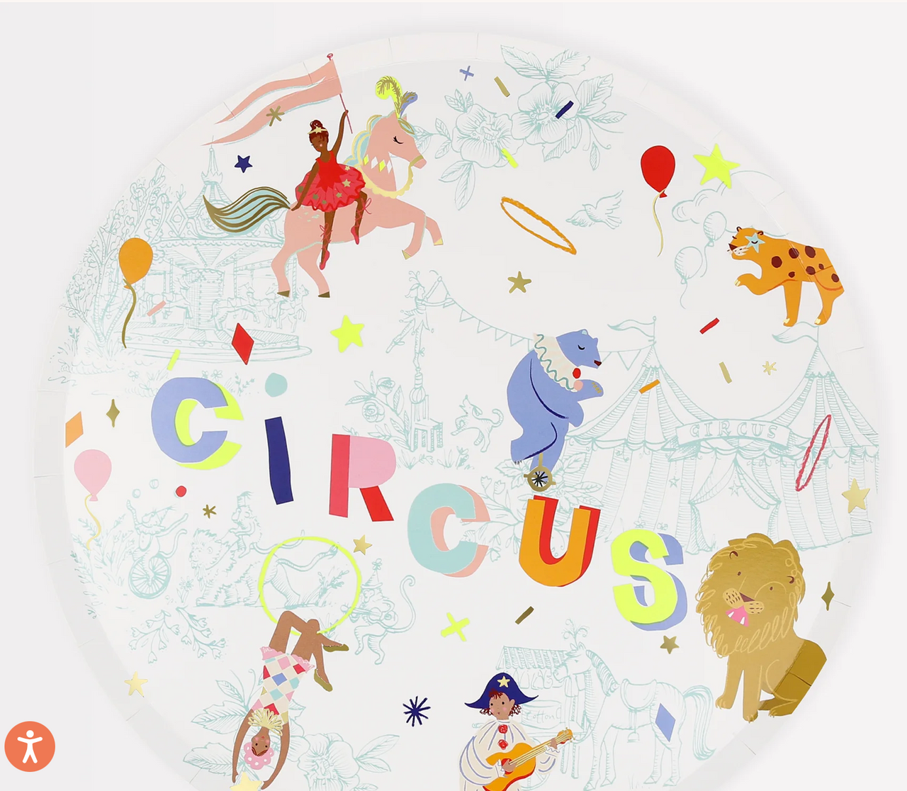 Roll up, roll up for all the fun of a circus party! These very special dinner plates incorporate a traditional toile circus pattern overlaid with fun graphics and illustrations, making them a fresh, contemporary take on a classic circus theme. Guaranteed to delight your guests.