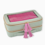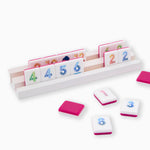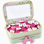Introducing Confetti Oh My Rummi, a swoon-worthy set that brings vibrant fun and sophisticated charm to your game nights. The bright pink tiles are perfectly paired with a light mint carrying case, creating a delightful color combination that's playful and elegant. Inside the case, you'll find the stunning watercolor art from the Capri Mat, a collaborative design by Catherine Cartie and Emily Nichols, adding a touch of artistic flair and beauty to every game you play.