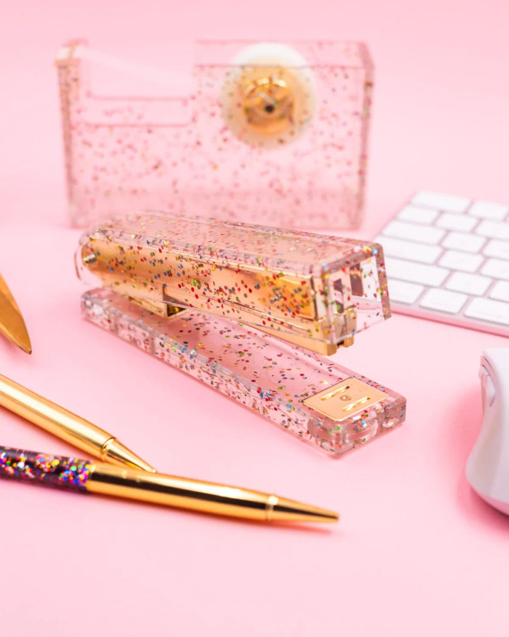 Bring the party to your desk with this confetti stapler! Designed to brighten up any desk, this cute stapler will bring a touch of fun to your daily tasks. Perfect for home, school, and office, this high-quality novelty stapler is not just cute but also functional; effortlessly security your documents. Don't blame us when you start looking for any excuse to staple!