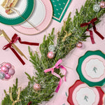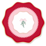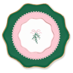 Our small dessert plates, measuring 8.5 inches, come in a pack with two delightful colorways - green & pink, and pink & red (four of each, totaling eight plates). Each plate features a delicate lace design adorned with mistletoe and gold foil berry details, beautifully tied together with a dainty bow.