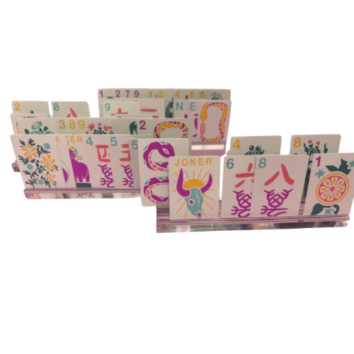 Bundle up and save with Desert Bloom American Mahjong Playing Cards! Pair them with the convenient Lucite card racks for an easier mahj-on-the-go experience. Cards and racks bundle, mahj-on-the-go made easy.