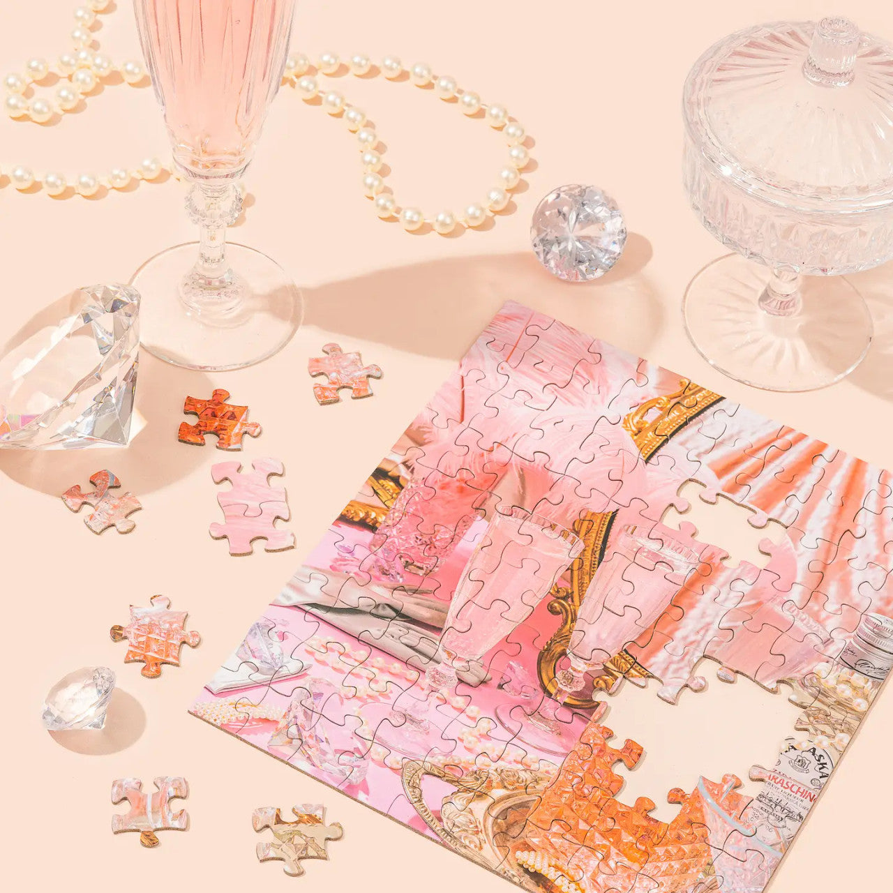 The life of glitz and glamour is only 100 pieces away with our Diamond Fizz mini cocktail puzzle. Diamonds, pearls, and pink champagne. What more could a girl ask need? Includes a custom recipe for the 'Diamond Fizz' glitz and glam cocktail. – 100 piece jigsaw puzzle – Complete Puzzle Dimensions: 8" x 9" – Box Dimensions: 5" x 5" x 2.2” All Pezel Puzzles are made with 100% recyclable materials and have a smooth velvet texture finish on both the outer box and puzzle pieces, ensuring each puzzle feels as good as it looks.
