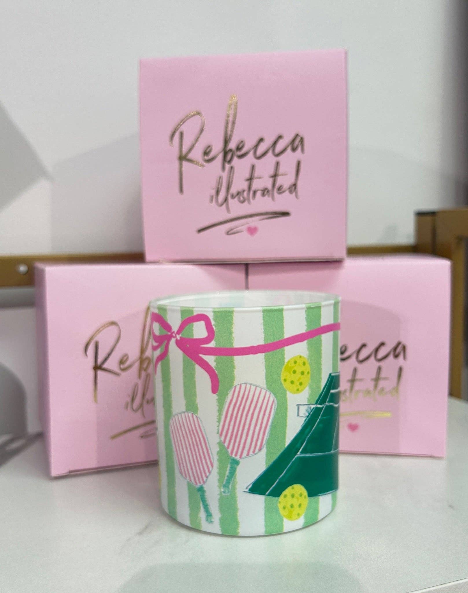 Wrapped in a pink and green striped design with whimsical tennis and pickleball paddles tied together with a bow, this candle is both a beautiful decor piece and a cozy everyday essential. Perfect for coffee tables, bedside styling, entertaining spaces, or gifting, it brings Rebecca Illustrated’s signature artful style into your home.