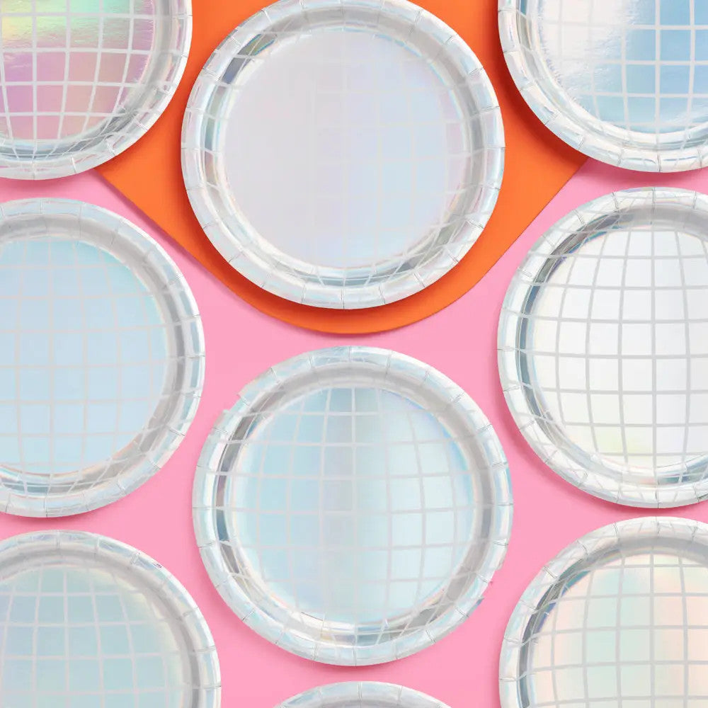 Let’s get groovy.|| Get down on it, girl! Be the dancing queen for a night with our totally groovy disco ball printed plates. The night is young and the music's high! 25 disco ball 9" dinner paper plate set Mirrored iridescent foil finish Perfect size for dinner or cake