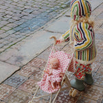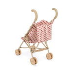 Doll stroller designed with a harness, carriage bag, and double wheels on all four legs for extra stability. Features removable fabric. Comes fully assembled and is easy to fold and store.