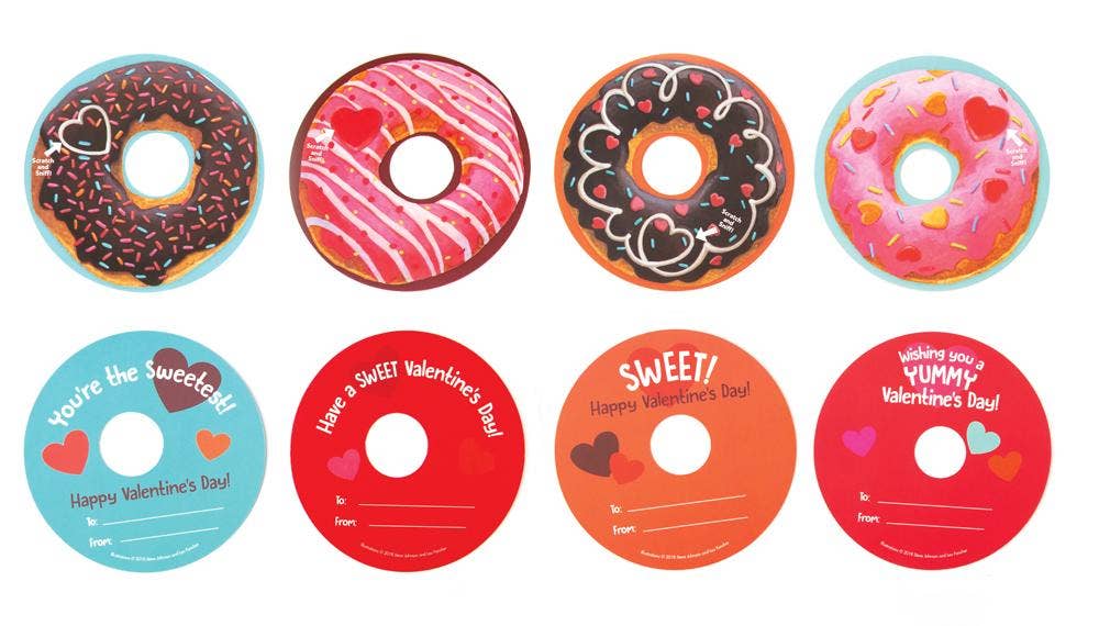 Chocolate and strawberry scented! Kids will love treating their friends to these valentines! These delicious looking Donut Valentine's Day Cards come in two scratches and sniff scents: chocolate and strawberry! Contains 28 cards (approximately 4.75 inches in diameter) and envelopes