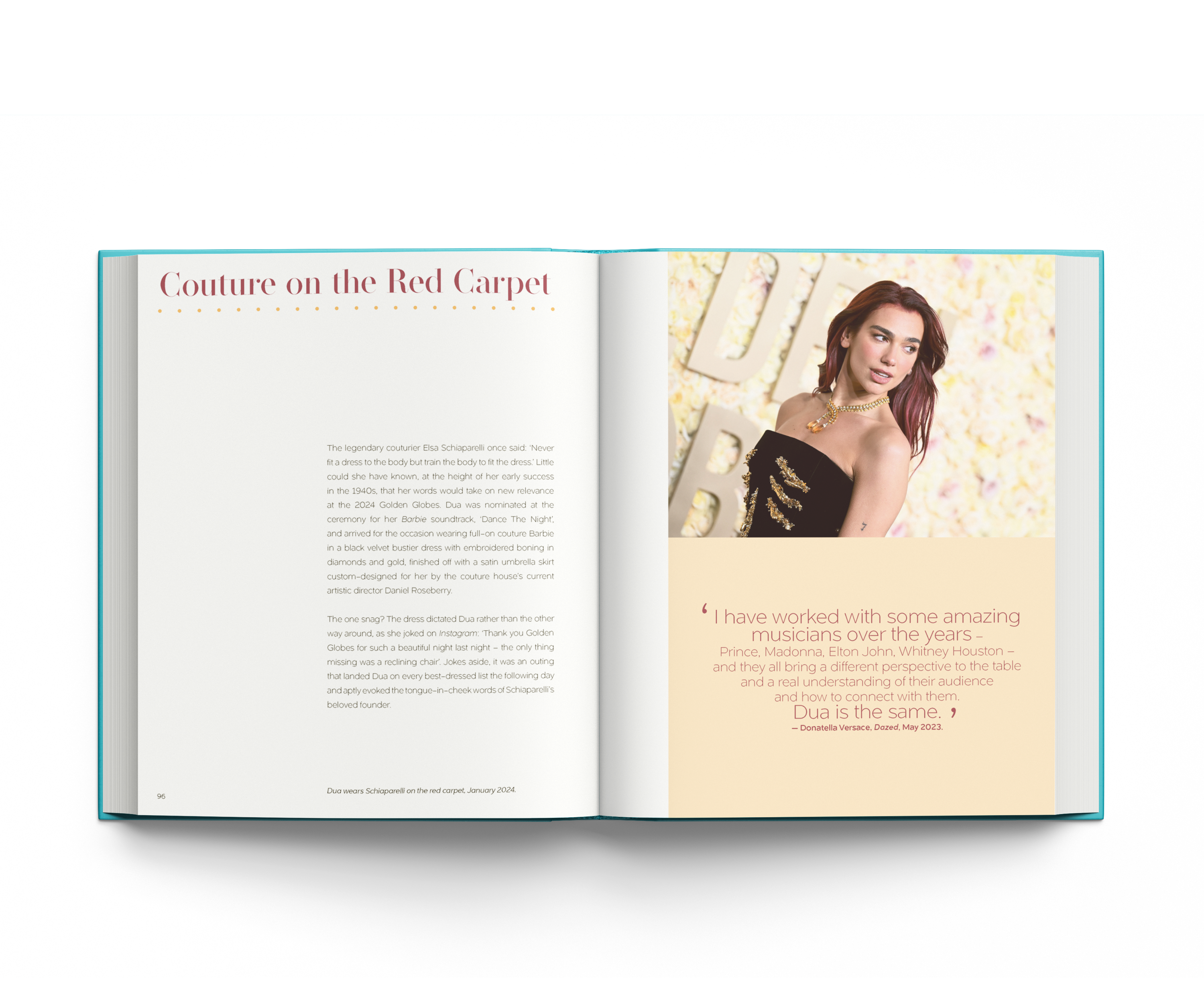 Born and raised in London, Dua showed promise as a performer in her mid-teens, and by her early twenties, had already won an armful of awards, including BRITs and Grammys. Frequently splashed on the covers of Teen Vogue, Elle, Clash and more, she has also starred as a model in ad campaigns and ambassadorial roles for Pepe Jeans, Puma, Adidas Originals and Versace. In 2023, Dua’s Barbie soundtrack, her acting debut in the film and her subsequent red-carpet appearances won her a legion of new followers around the world.