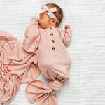 The easiest tie-bottom outfit for day or night. Made for hassle free diaper changes and gentle dressing, I designed this with a button-down front and tie bottom for simple closure (no more snaps at 2am!). Fold over wrist cuffs are the most thoughtful finishing touch.