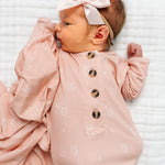 The easiest tie-bottom outfit for day or night. Made for hassle free diaper changes and gentle dressing, I designed this with a button-down front and tie bottom for simple closure (no more snaps at 2am!). Fold over wrist cuffs are the most thoughtful finishing touch