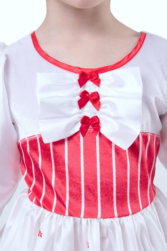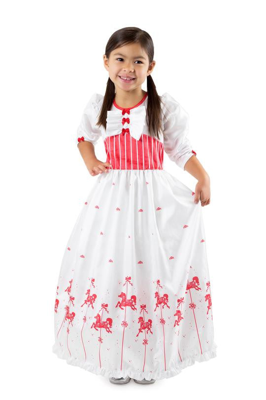 This magical English Nanny dress will have your little one ready to clean, dance, and sing the day away! They'll be nearly perfect in every way! The dress begins with a crushed velvet bodice and soft satin sleeves, with red bow accents. The china silk skirt is super soft and non-itchy, with a beautiful merry-go-round design.