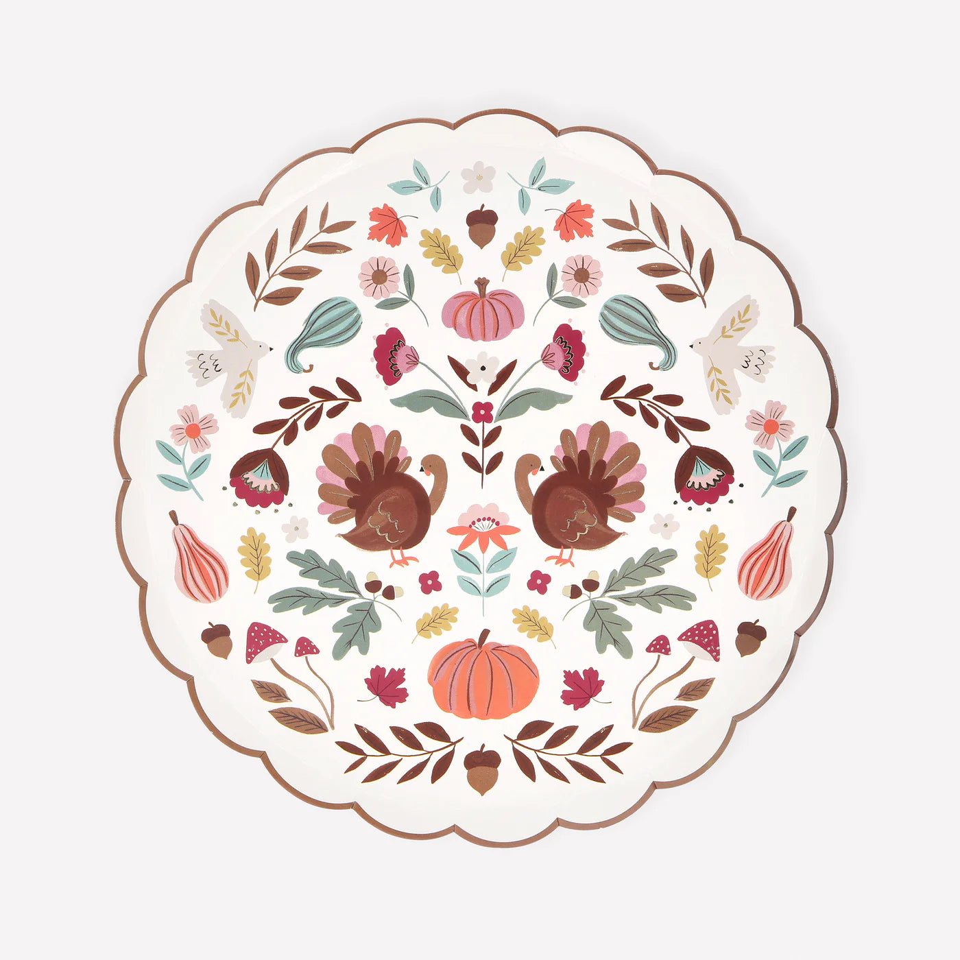 A folk theme is the ultimate way to embrace the charm of fall and Thanksgiving. Rich, earthy colors embody this season's warm tones, while harvest-inspired symbols celebrate nature's beauty. Our clever designers have re-imagined these timeless elements for these stylish paper plates, bringing a perfect blend of tradition and trend to your party table
