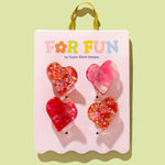 These heart-shaped mini claw clips in pink and red are designed specifically for tweens, offering a playful yet practical accessory to keep hair neatly styled. The confetti is hand-sprinkled into the acrylic, which means no shedding. Because of this unique process, no two pieces will be exactly alike. Details: * Includes 4 mini clips * 2 pink + red confetti clips, 1 pink & 1 red acetate acid clips * Clip size: 1.25" * Backer card size: 3.5" x 5" * Gold Ric Rac ribbon hanger on back of card * Imported For Fun is all about playful accessories made just for tween girls. Our collection of jewelry and accessories is youthful, on-trend, and designed to let your personality shine - because growing up doesn't mean outgrowing your sparkle. We are believers in happy colors, big dreams, and being unapologetically you. From sleepovers to school days, our pieces help girls express who they are: bright, creative, and totally original.