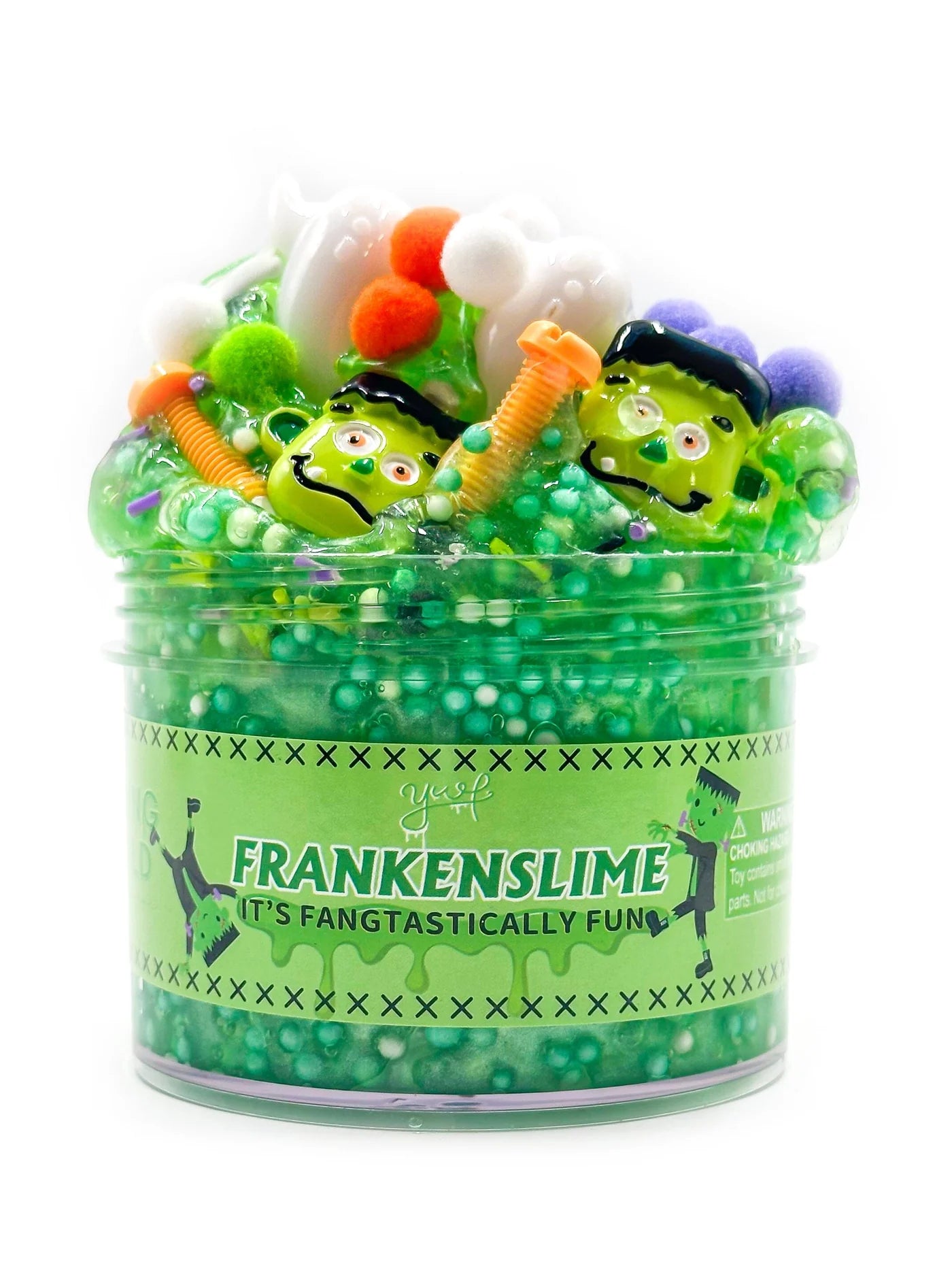 Frankenslime is a gooey green slime with a watermelon scent and packed with spooky mix-ins. Add tiny foam beads, white acrylic ghosts, nuts and bolts, googly eyes, and Frankenstein charms to bring your monster to life.