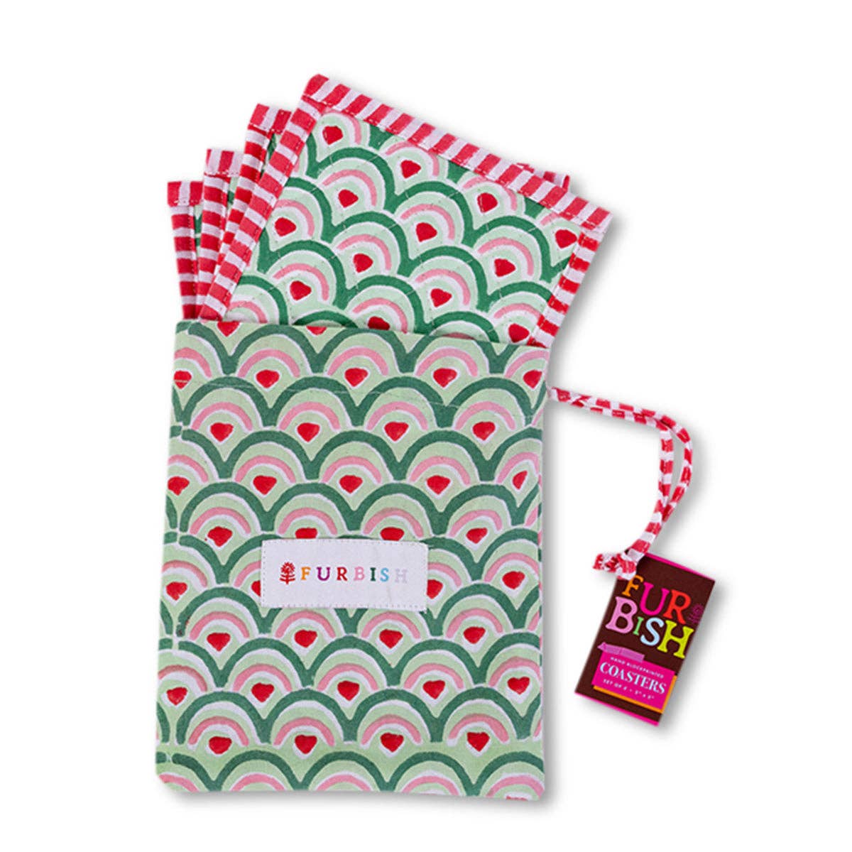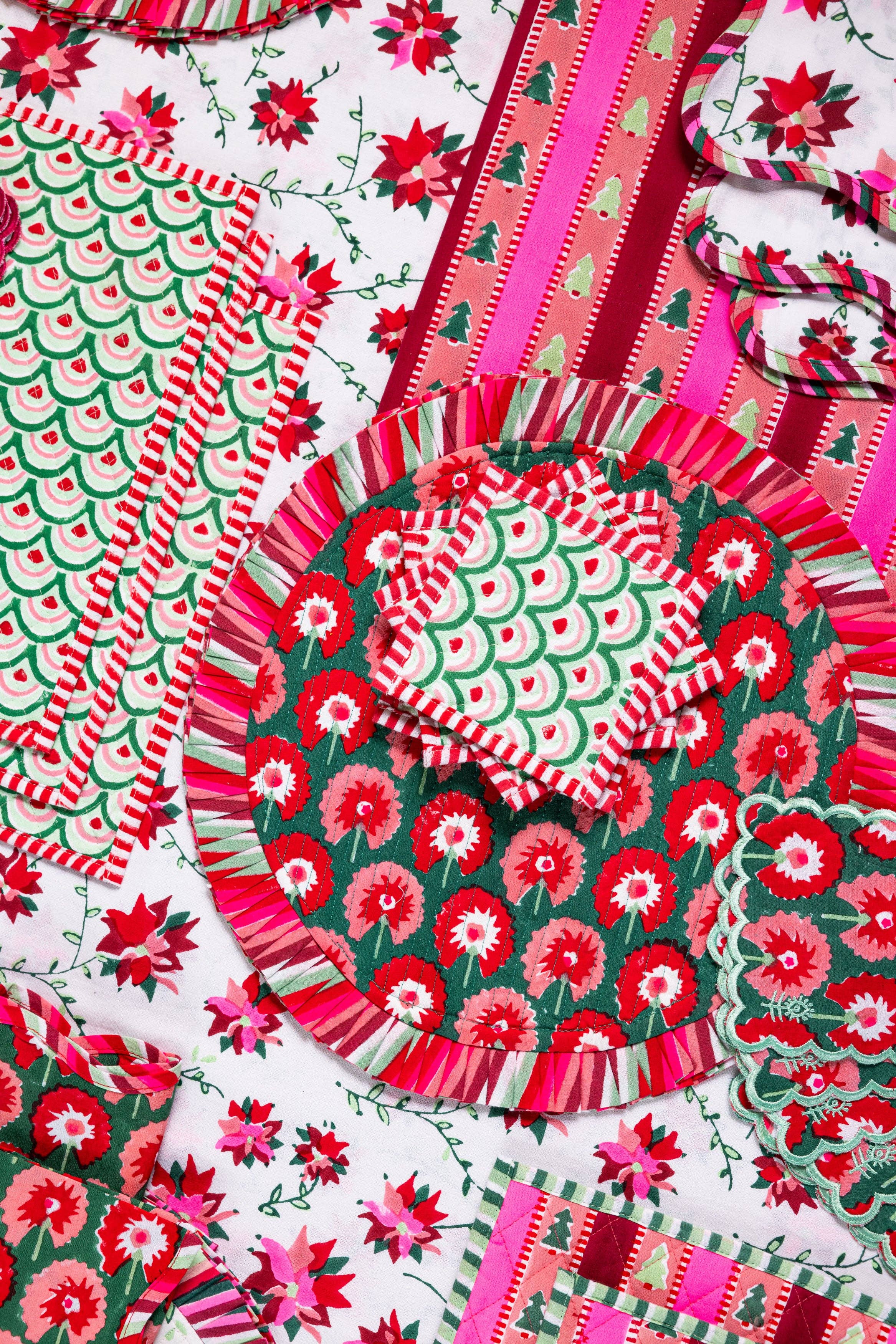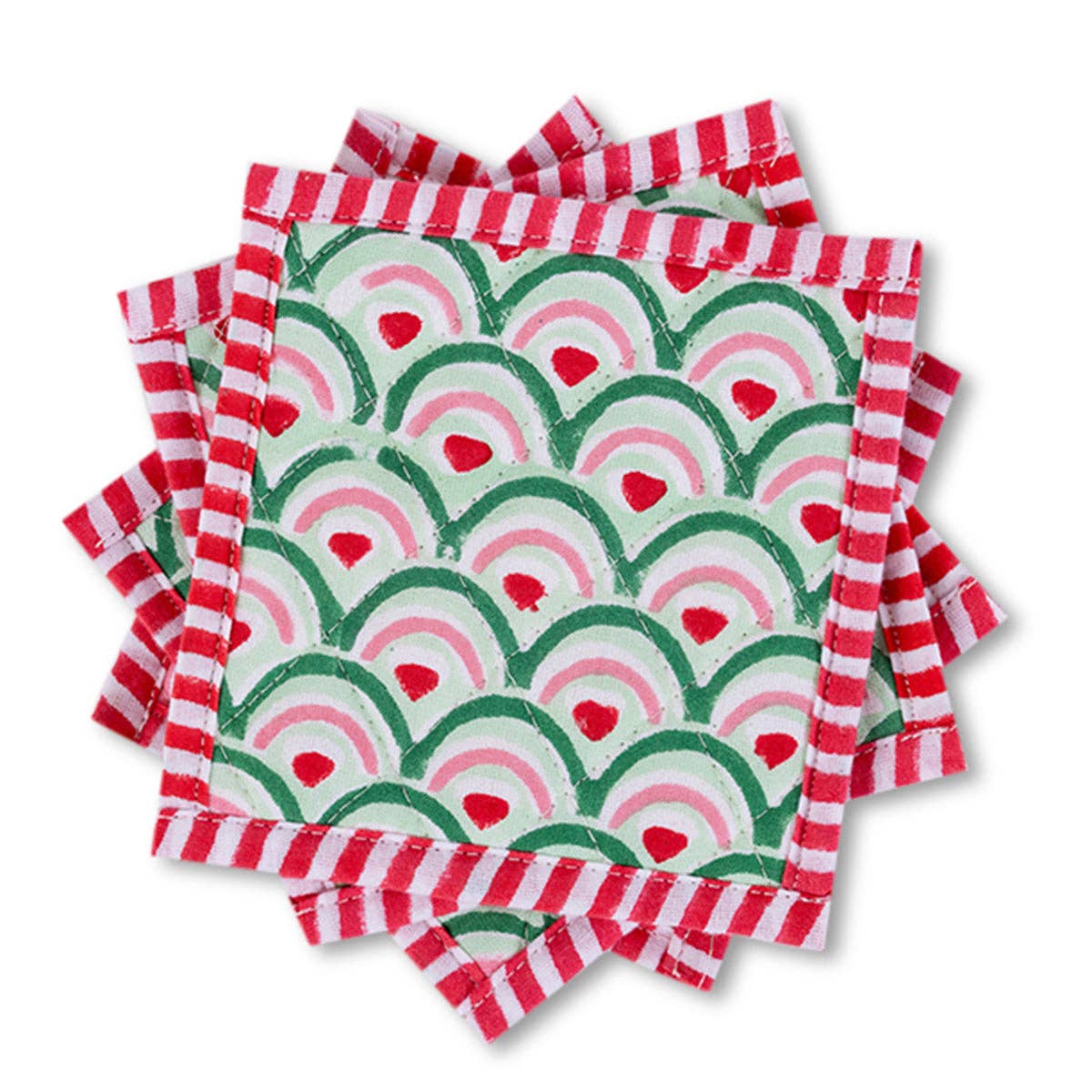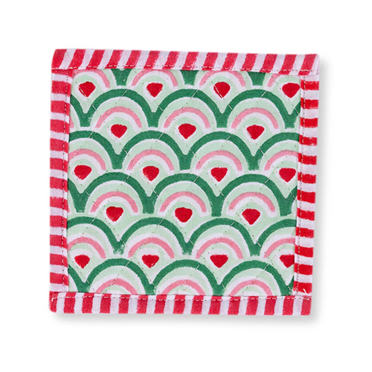 The holidays get extra festive with our exclusive blockprint quilted coasters. We love the charming color combo and the chic striped trim. Makes an excellent gift!
