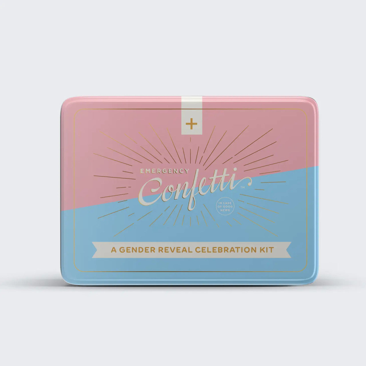 A confetti kit to help celebrate one of life's most fun surprises- a baby's gender! This kit includes 4 poppers- 2 pink & 2 blue, 4 clean up aids, 1 reusable tin, and instructions on how to keep the news a surprise until the right moment.