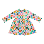 Artist Collab! Artist Samantha Johnson takes a modern approach to the holidays this season! A colorful checkerboard of bright squares with the saying Merry and Bright in script scattered across our button down Girls Autumn Dress lights up every room. A pink glitter button front closure adds to the fresh and fun look. This one of a kind piece sends a message that will last throughout the year.