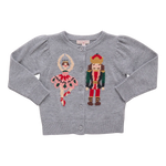 Hooray for the holidays! Holiday favorite The Nutcracker takes centerstage on our charming Girls Constance Sweater. Pink and green sparkle details on the Sugarplum Fairy and The Prince bring this classic cardigan to life. A soft gathered puff shoulder, ribbed waist and cuffs and a silver glitter button closure elevate this well-loved shape.