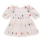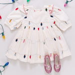 Strings of joyful embroidered Christmas Lights light up a winter white ground on our collection classic Girls Brooke Dress. Dressed up designer details include a rounded neck, a pink pearl stitched ruffle at the top of the 3/4 puff sleeve, full twirl-worthy skirt and silver glitter buttons at the back.