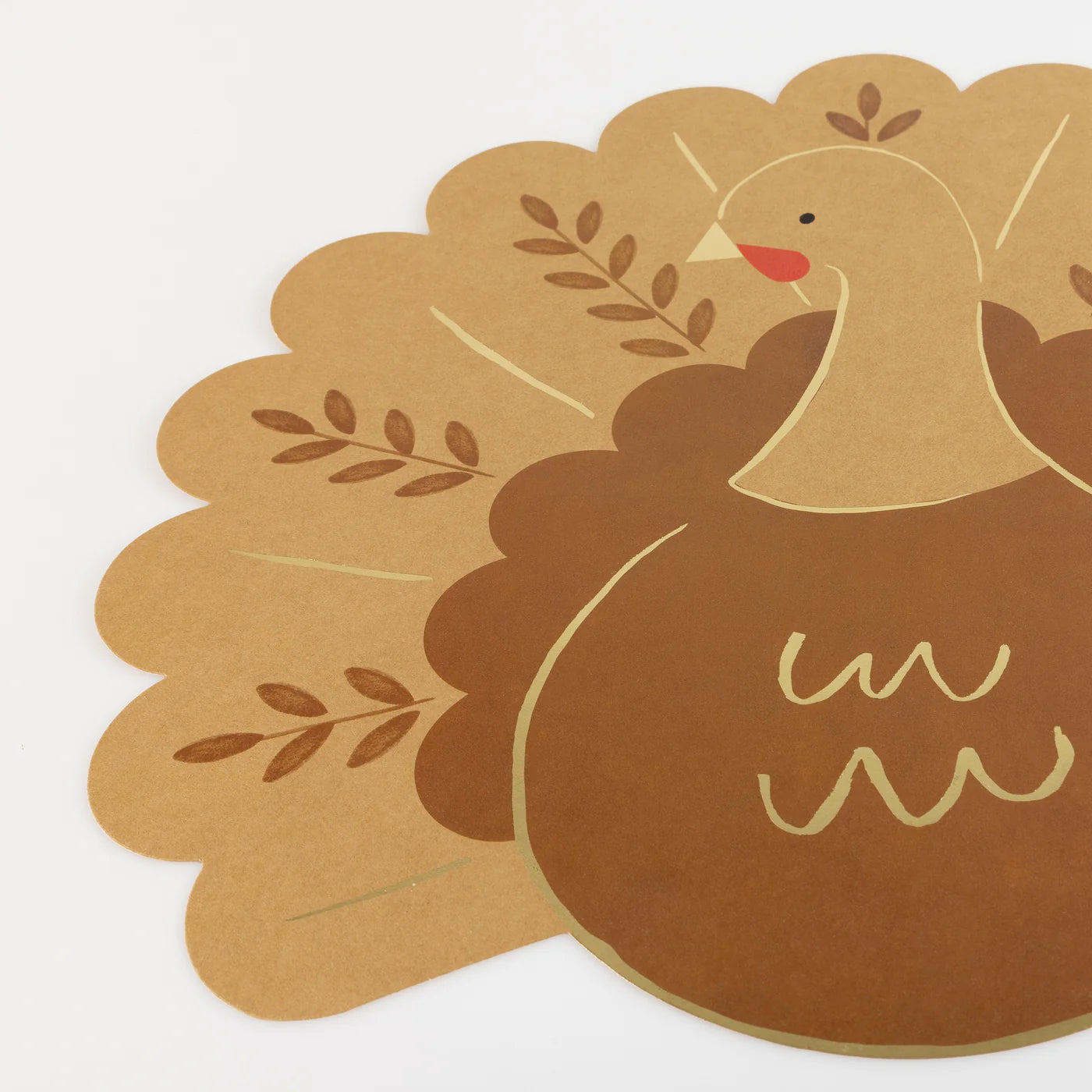 It's time to give thanks in style! Add charm and cheer to your Thanksgiving table with these large turkey paper placemats. A blend of rustic autumn hues, leaf designs and shiny gold foil accents, create a traditional look with a contemporary twist, perfect for a celebration that's as vibrant as the season