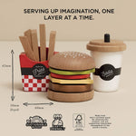 Serve up a delicious playtime treat with this 13-piece Wooden Hamburger Meal Set, beautifully crafted from FSC®-certified sustainable wood. This complete fast-food set includes a Velcro hamburger with a bun, patty, lettuce leaf, tomato, and cheese, allowing little chefs to build their perfect burger.