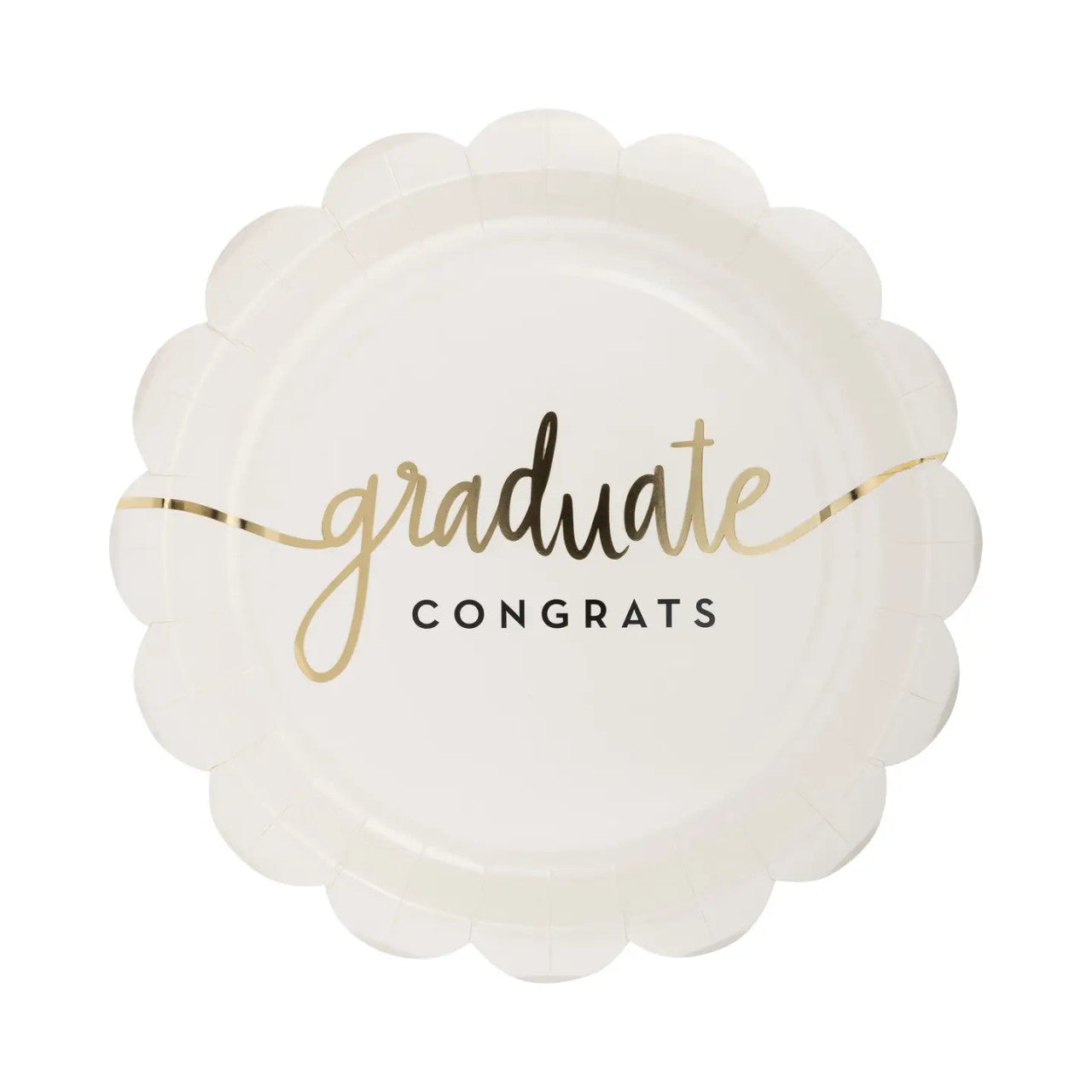 Celebrate your graduate's accomplishments with our Graduate Congrats Plate! This gold foil plate exclaims "congrats grad" in a playful and stylish way, making it the perfect addition to any graduation party. Cheers to their success! • includes 8 scalloped paper plates • 9 x 9 inches • gold foil