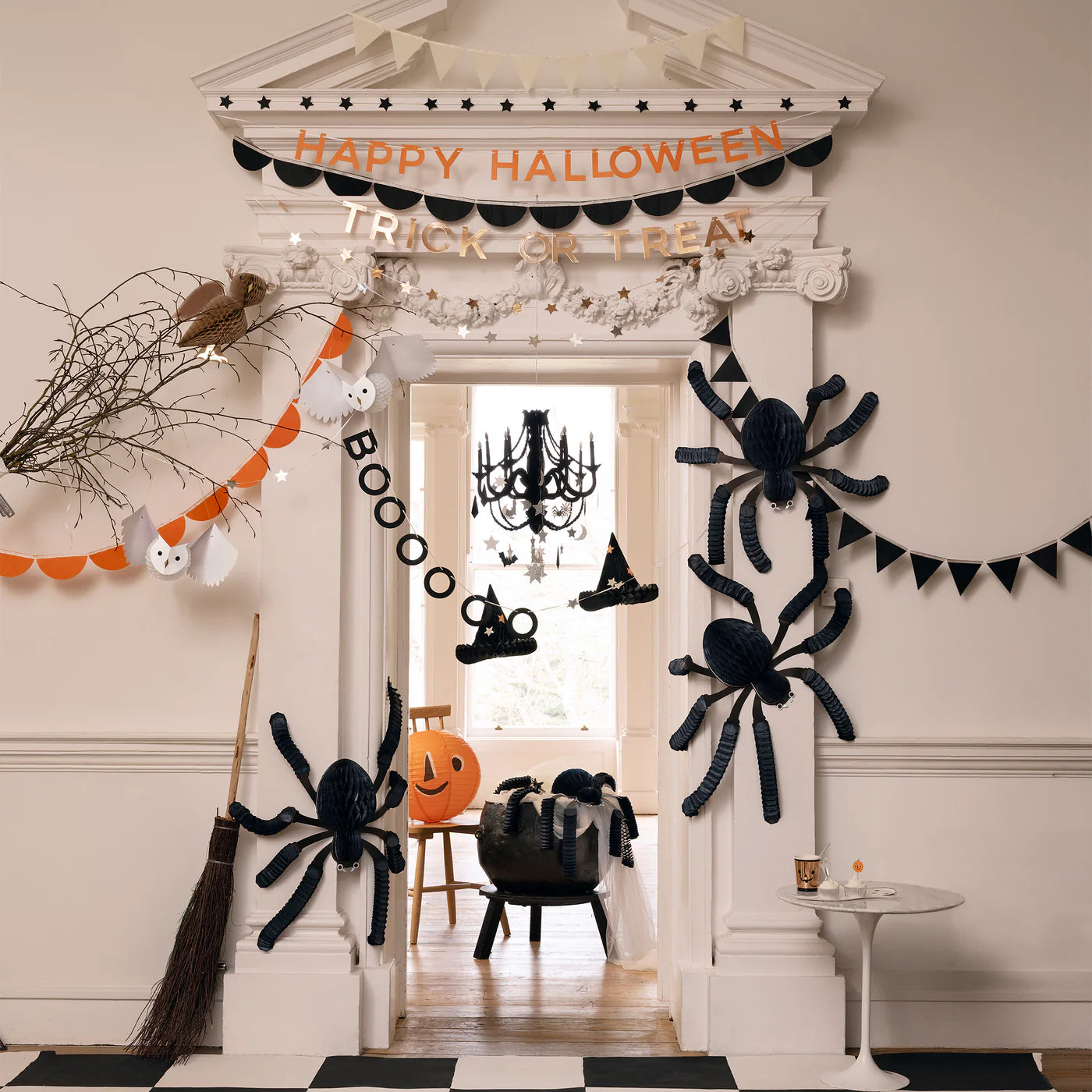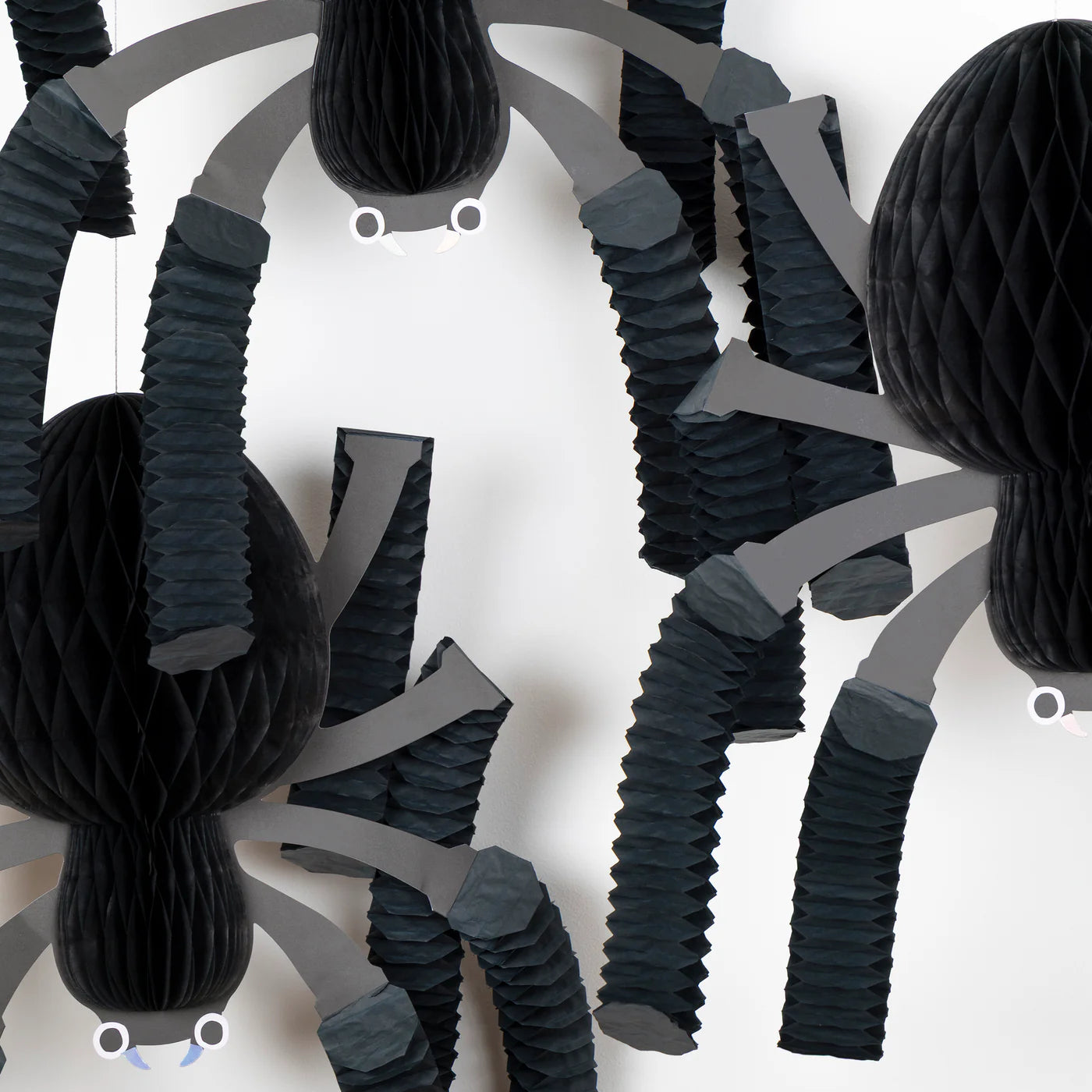 Watch out, there's a spider about! But don't worry, our clever designers have crafted these oversized spiders to be hauntingly fun Halloween decorations. Their big eyes, textured honeycomb bodies, silver foil pincers and long dangling legs, add just the right amount of eerie charm. Hang them in the porch, from trees, in windows, or from the ceiling, for a spine-tingling effect. When the season's over, pack them away for next year